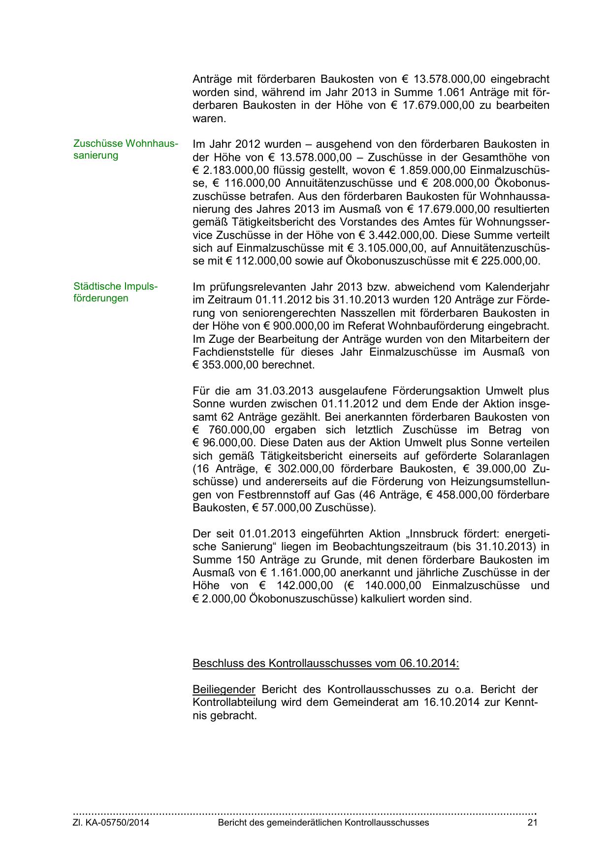 Beschluss des Kontrollausschusses vom 06.10.2014: