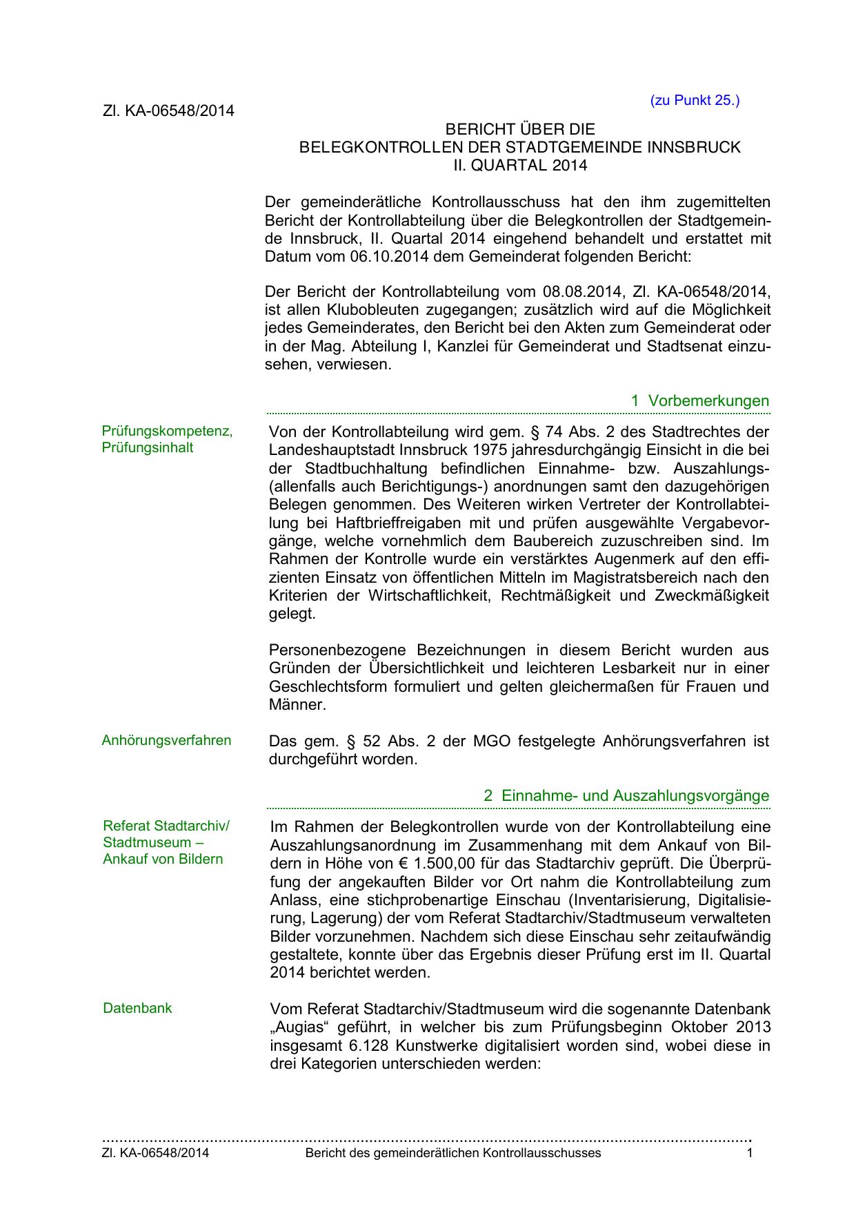 Bericht der Kontrollabteilung über die Belegkontrollen der Stadtgemeinde Innsbruck, II. Quartal 2014 eingehend behandelt und erstattet mit