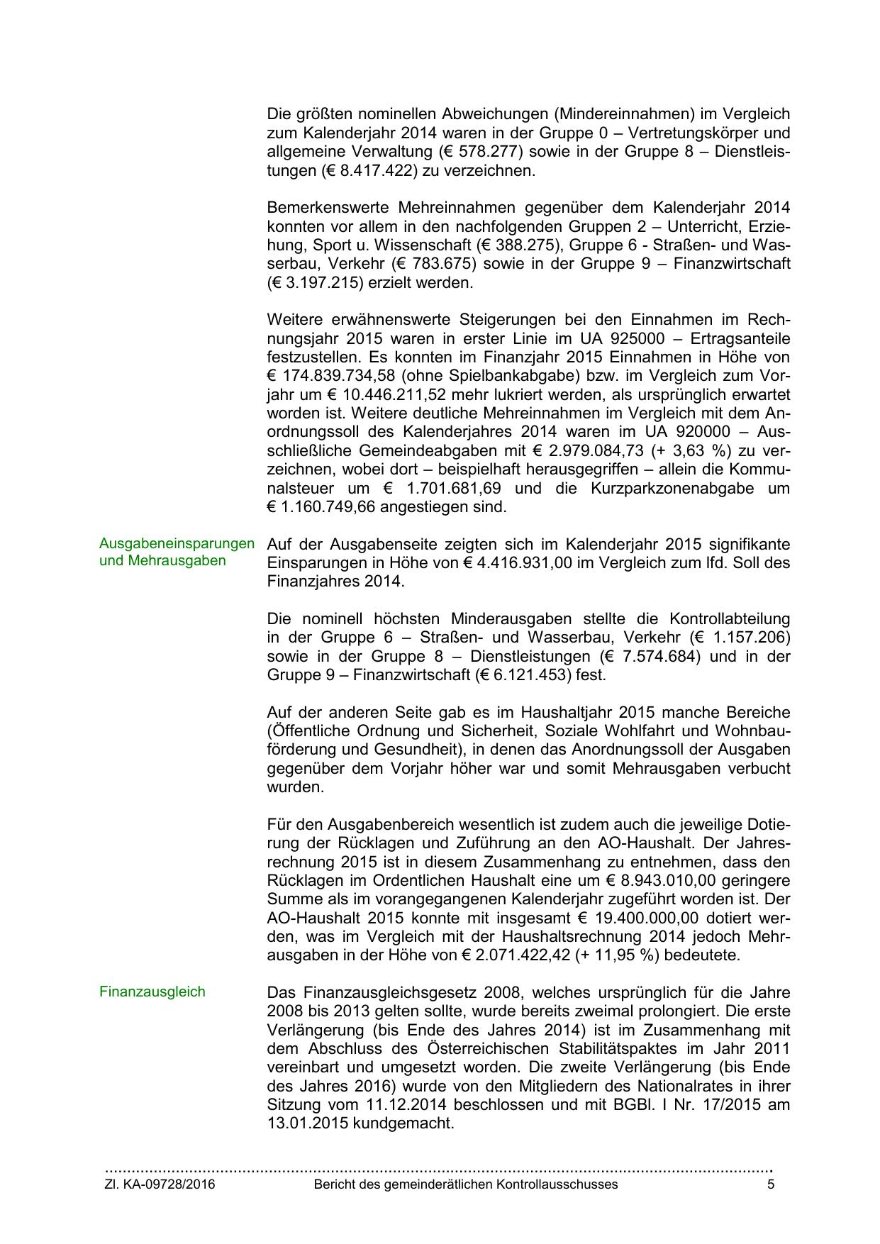 worden ist. Weitere deutliche Mehreinnahmen im Vergleich mit dem Anordnungssoll des Kalenderjahres 2014 waren im UA 920000 – Ausschließliche Gemeindeabgaben mit € 2.979.084,73 (+ 3,63 %) zu verzeichnen, wobei dort – beispielhaft herausgegriffen – allein die Kommunalsteuer um € 1.701.681,69 und die Kurzparkzonenabgabe um