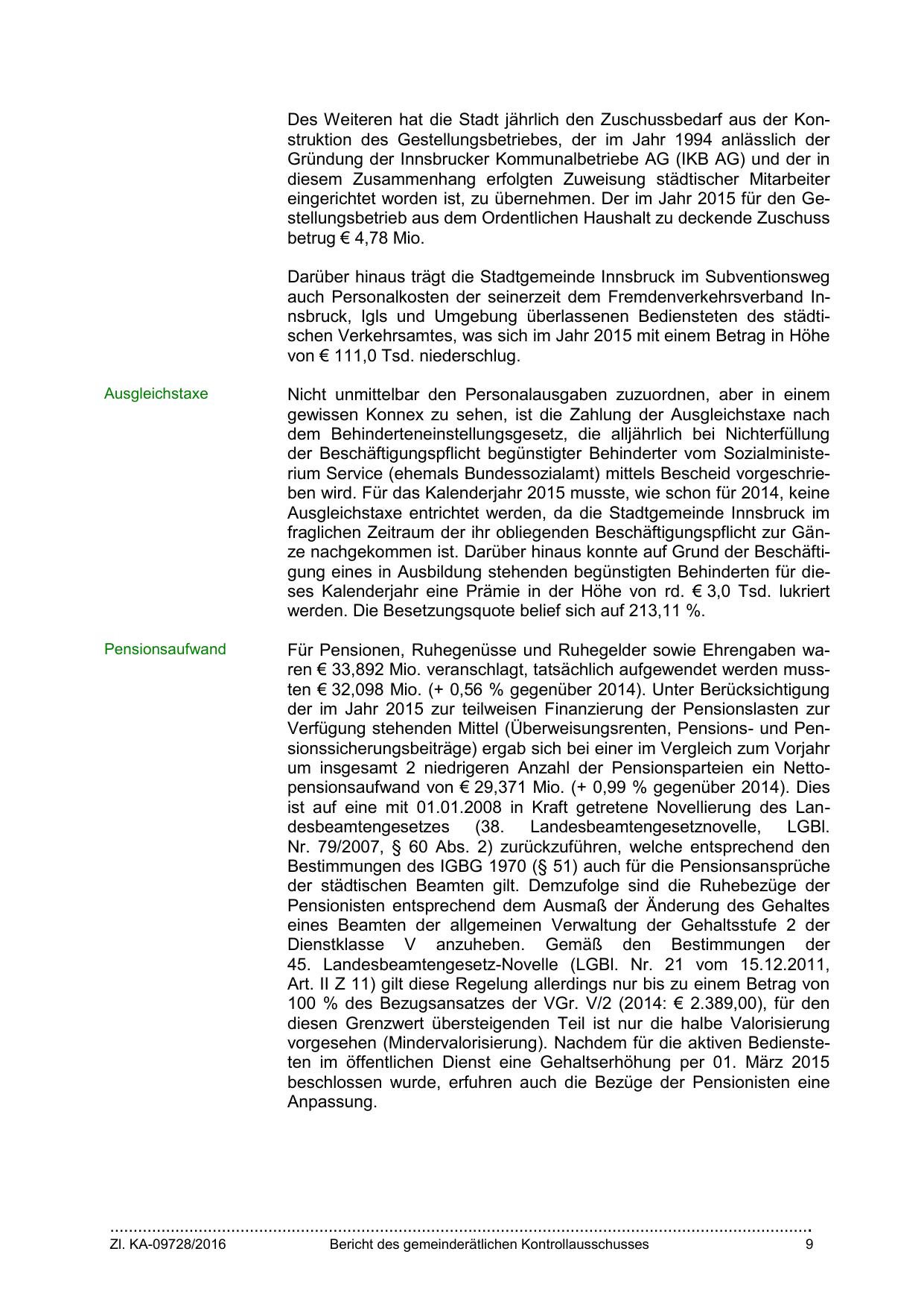 Für Pensionen, Ruhegenüsse und Ruhegelder sowie Ehrengaben waren € 33,892 Mio. veranschlagt, tatsächlich aufgewendet werden mussten € 32,098 Mio. (+ 0,56 % gegenüber 2014). Unter Berücksichtigung