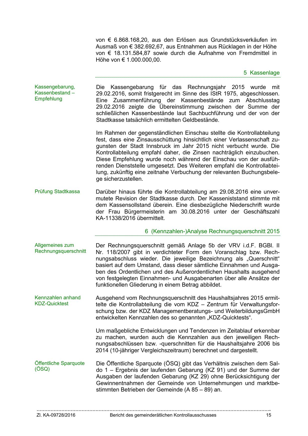 Ausgehend vom Rechnungsquerschnitt des Haushaltsjahres 2015 ermittelte die Kontrollabteilung die vom KDZ – Zentrum für Verwaltungsforschung bzw. der KDZ Managementberatungs- und WeiterbildungsGmbH
