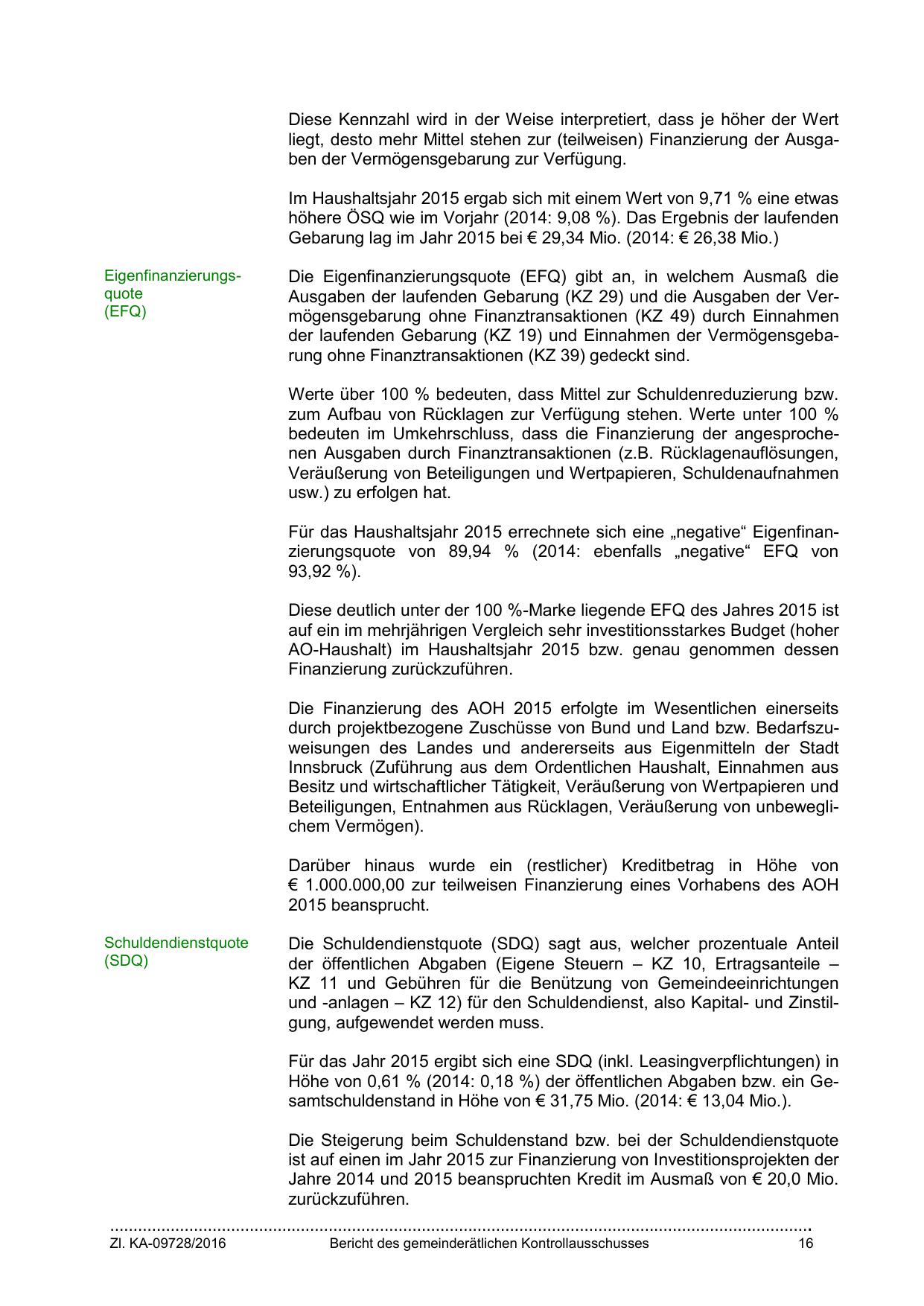 Für das Haushaltsjahr 2015 errechnete sich eine „negative“ Eigenfinanzierungsquote von 89,94 % (2014: ebenfalls „negative“ EFQ von