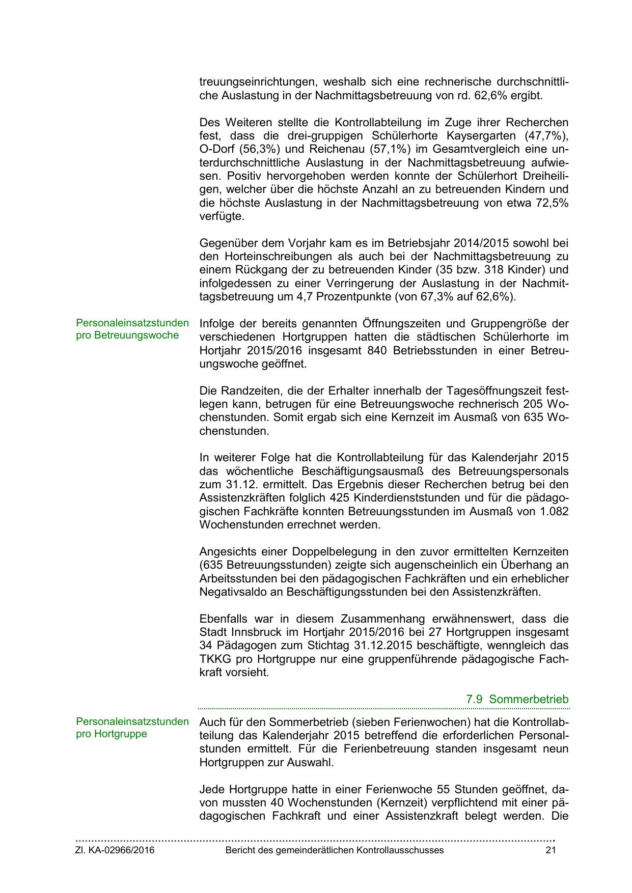 O-Dorf (56,3%) und Reichenau (57,1%) im Gesamtvergleich eine unterdurchschnittliche Auslastung in der Nachmittagsbetreuung aufwiesen. Positiv hervorgehoben werden konnte der Schülerhort Dreiheiligen, welcher über die höchste Anzahl an zu betreuenden Kindern und