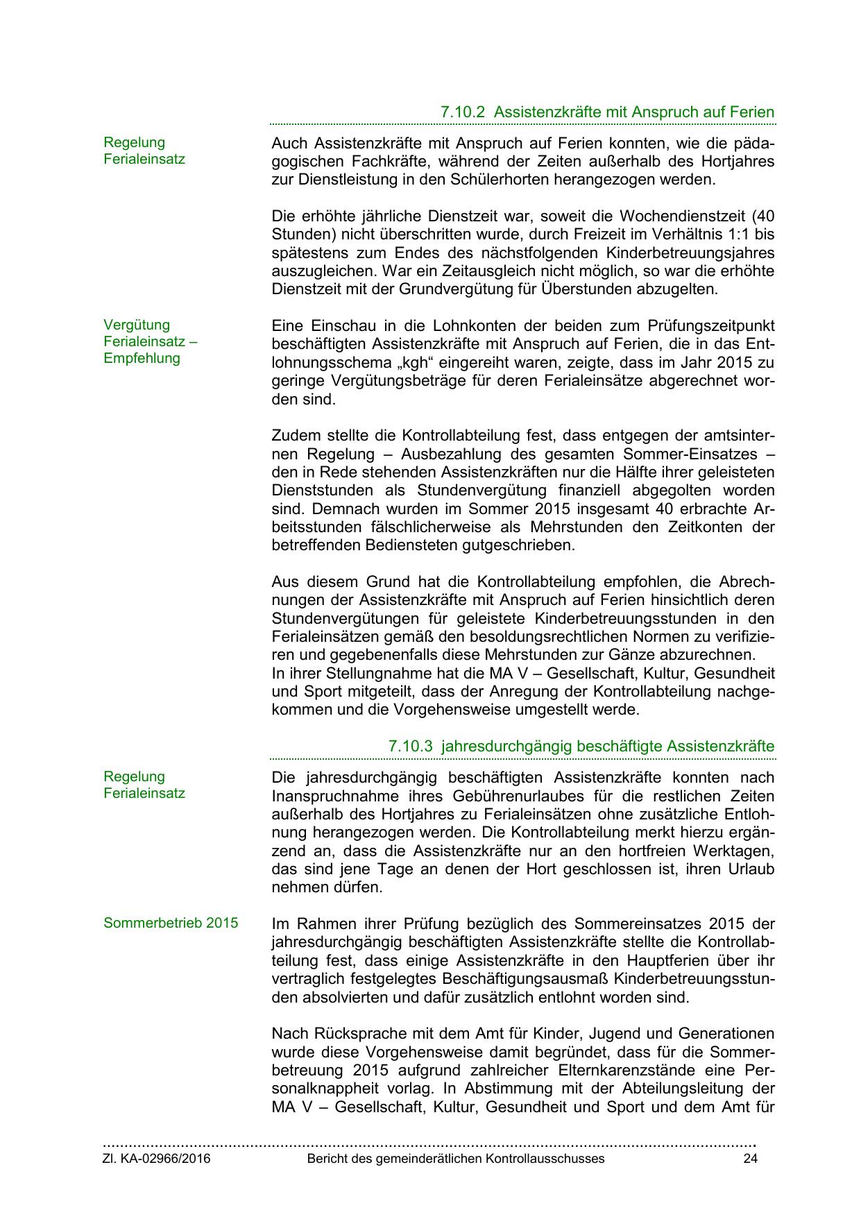 außerhalb des Hortjahres zu Ferialeinsätzen ohne zusätzliche Entlohnung herangezogen werden. Die Kontrollabteilung merkt hierzu ergänzend an, dass die Assistenzkräfte nur an den hortfreien Werktagen,