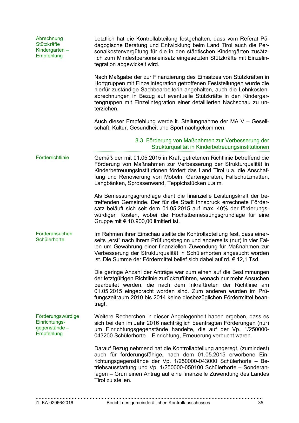 Letztlich hat die Kontrollabteilung festgehalten, dass vom Referat Pädagogische Beratung und Entwicklung beim Land Tirol auch die Personalkostenvergütung für die in den städtischen Kindergärten zusätzlich zum Mindestpersonaleinsatz eingesetzten Stützkräfte mit Einzelintegration abgewickelt wird.