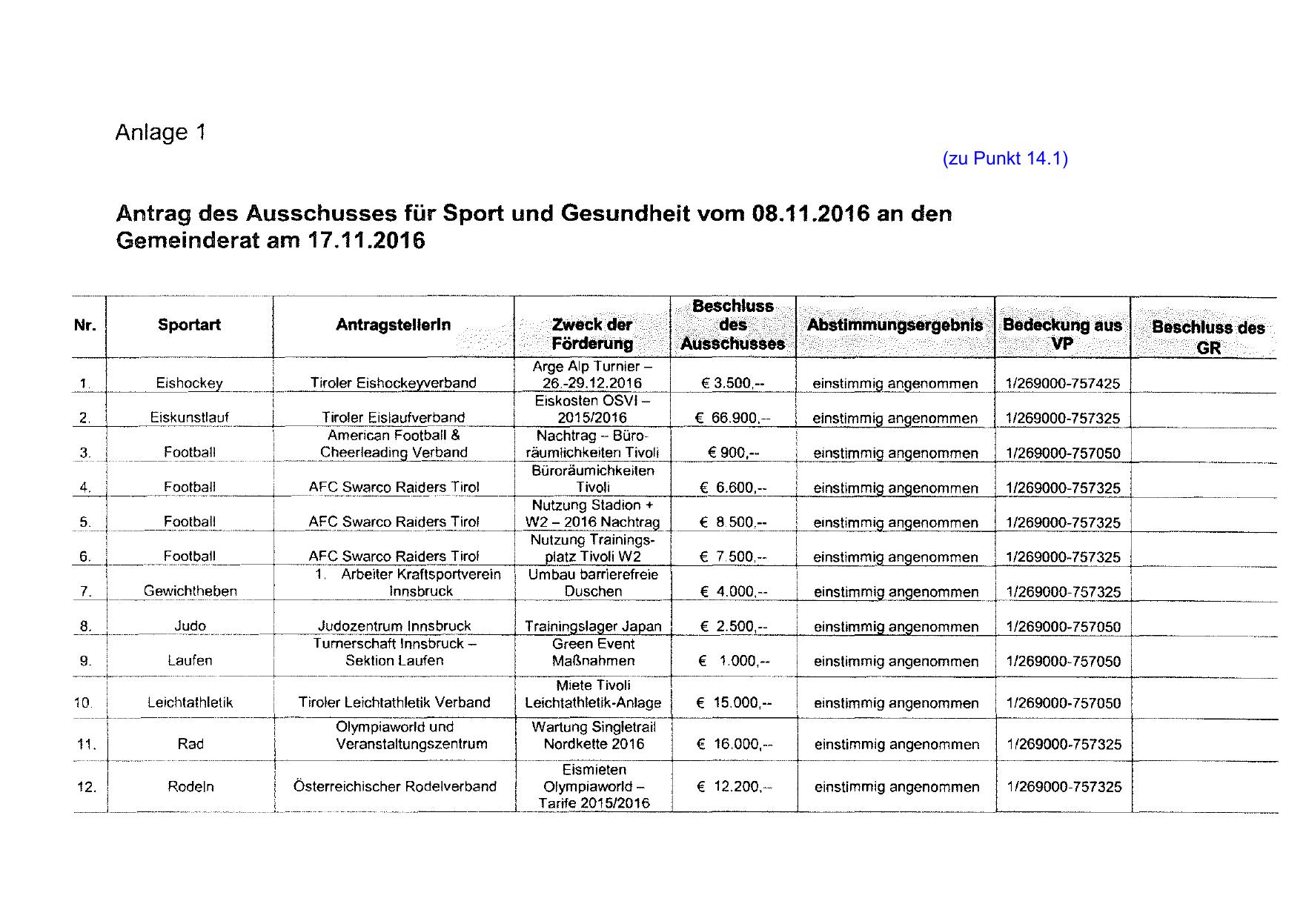 Antrag des Ausschusses für Sport und Gesundheit vom 08.11.2016 an den
