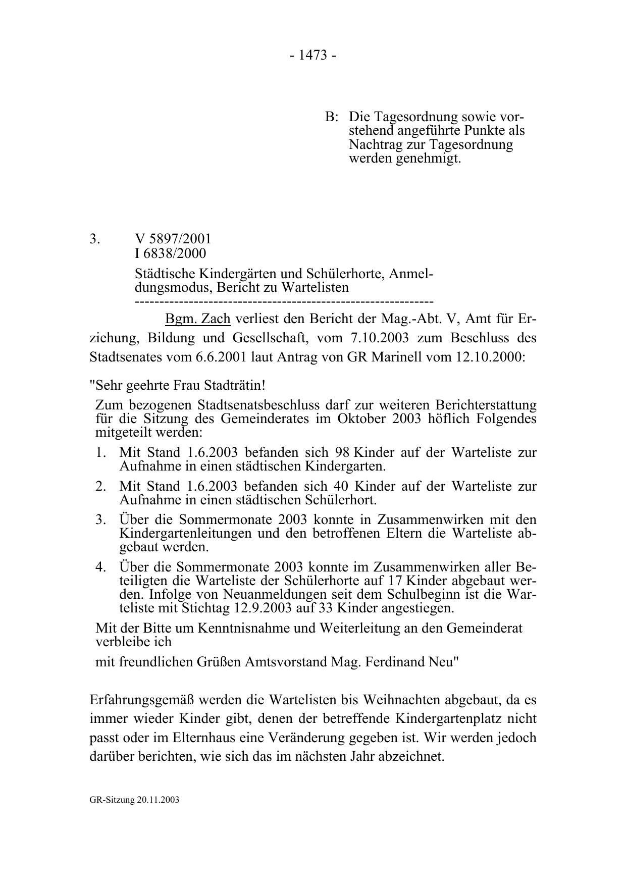 ------------------------------------------------------------Bgm. Zach verliest den Bericht der Mag.-Abt. V, Amt für Erziehung, Bildung und Gesellschaft, vom 7.10.2003 zum Beschluss des