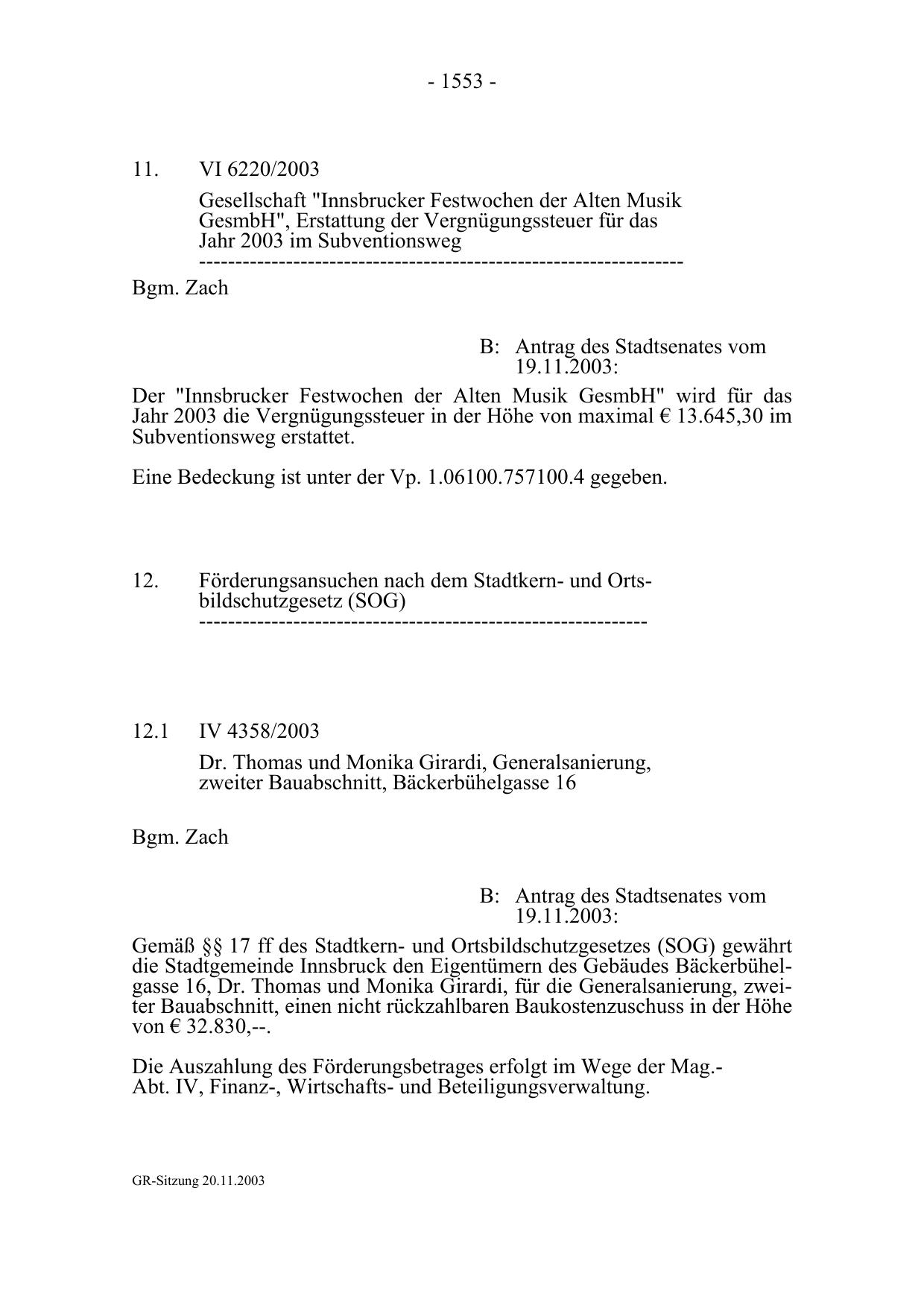 die Stadtgemeinde Innsbruck den Eigentümern des Gebäudes Bäckerbühelgasse 16, Dr. Thomas und Monika Girardi, für die Generalsanierung, zweiter Bauabschnitt, einen nicht rückzahlbaren Baukostenzuschuss in der Höhe