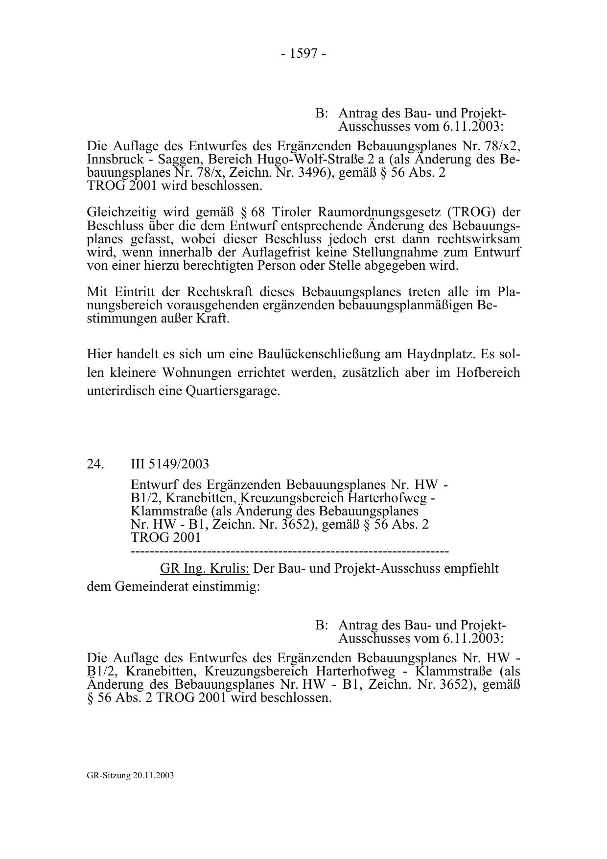 B: Antrag des Bau- und ProjektAusschusses vom 6.11.2003: