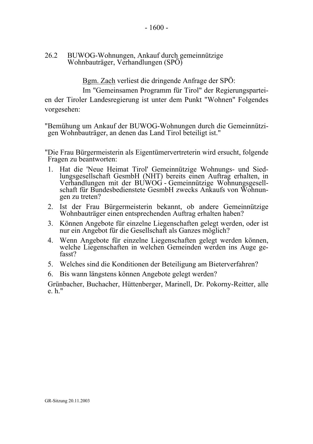 "Bemühung um Ankauf der BUWOG-Wohnungen durch die Gemeinnützigen Wohnbauträger, an denen das Land Tirol beteiligt ist."