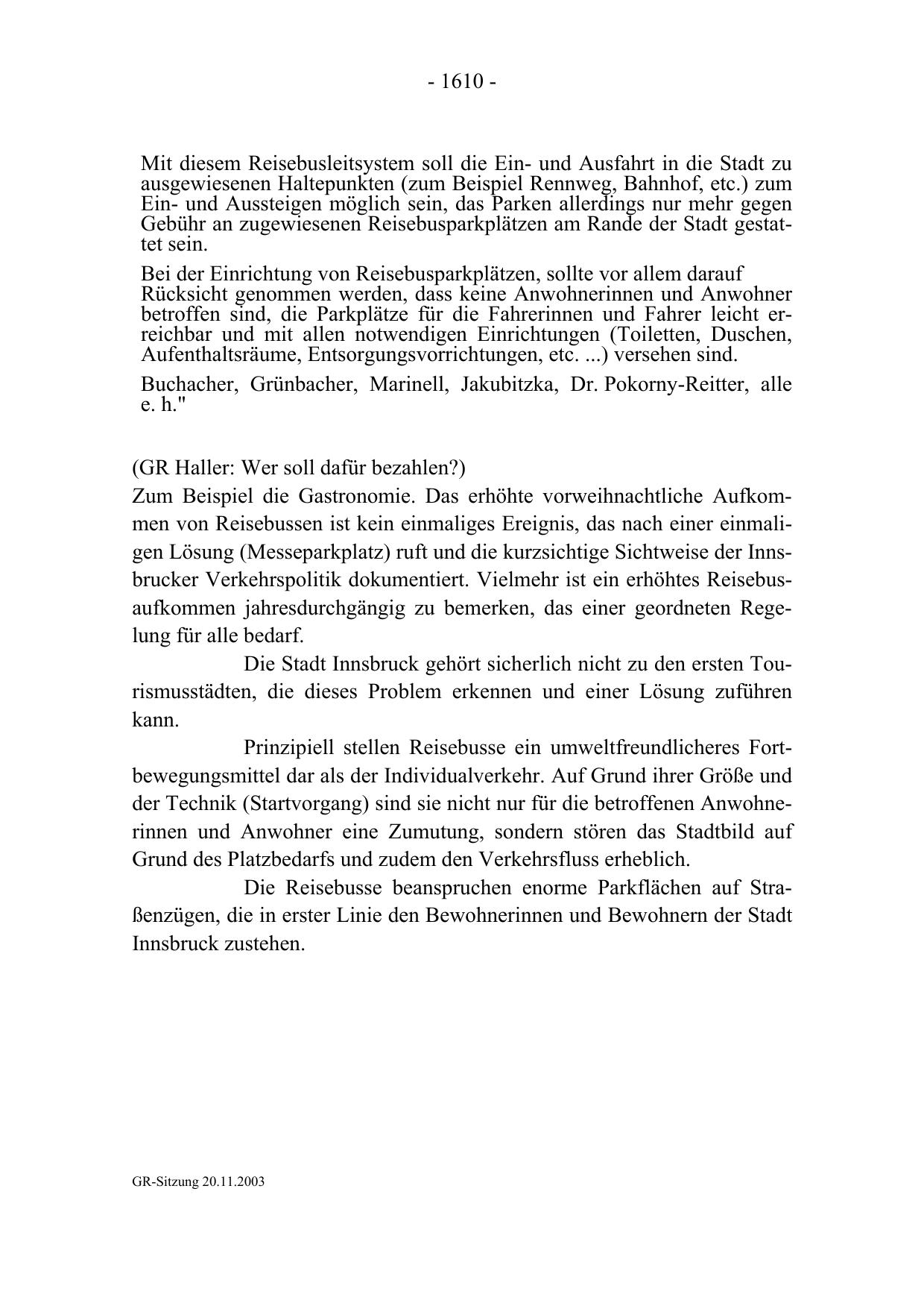 Zum Beispiel die Gastronomie. Das erhöhte vorweihnachtliche Aufkommen von Reisebussen ist kein einmaliges Ereignis, das nach einer einmaligen Lösung (Messeparkplatz) ruft und die kurzsichtige Sichtweise der Innsbrucker Verkehrspolitik dokumentiert. Vielmehr ist ein erhöhtes Reisebusaufkommen jahresdurchgängig zu bemerken, das einer geordneten Regelung für alle bedarf.