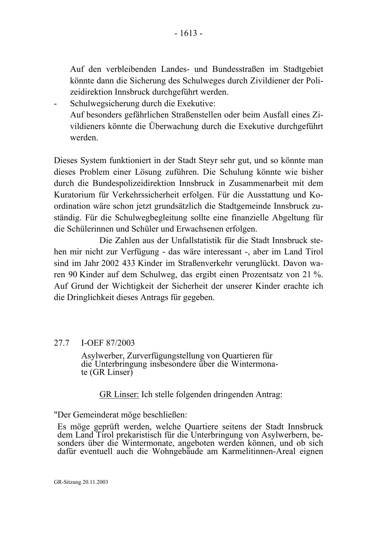 Kuratorium für Verkehrssicherheit erfolgen. Für die Ausstattung und Koordination wäre schon jetzt grundsätzlich die Stadtgemeinde Innsbruck zuständig. Für die Schulwegbegleitung sollte eine finanzielle Abgeltung für
