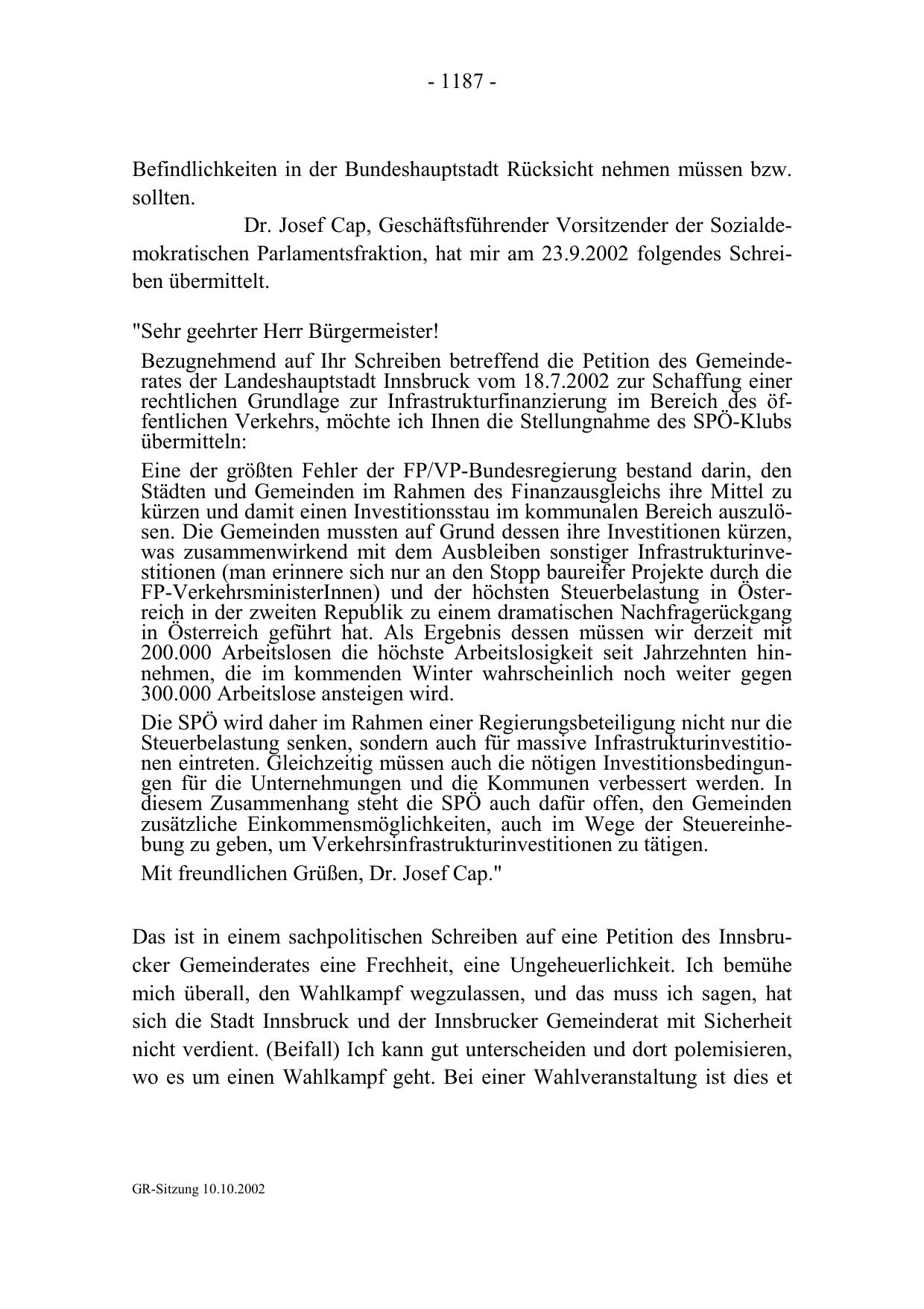 Dr. Josef Cap, Geschäftsführender Vorsitzender der Sozialdemokratischen Parlamentsfraktion, hat mir am 23.9.2002 folgendes Schreiben übermittelt.
