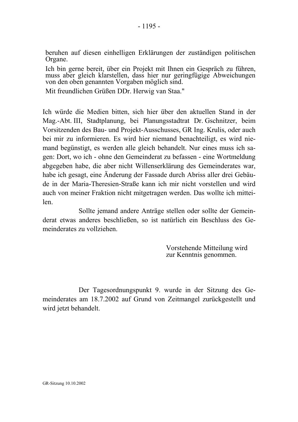 Der Tagesordnungspunkt 9. wurde in der Sitzung des Gemeinderates am 18.7.2002 auf Grund von Zeitmangel zurückgestellt und