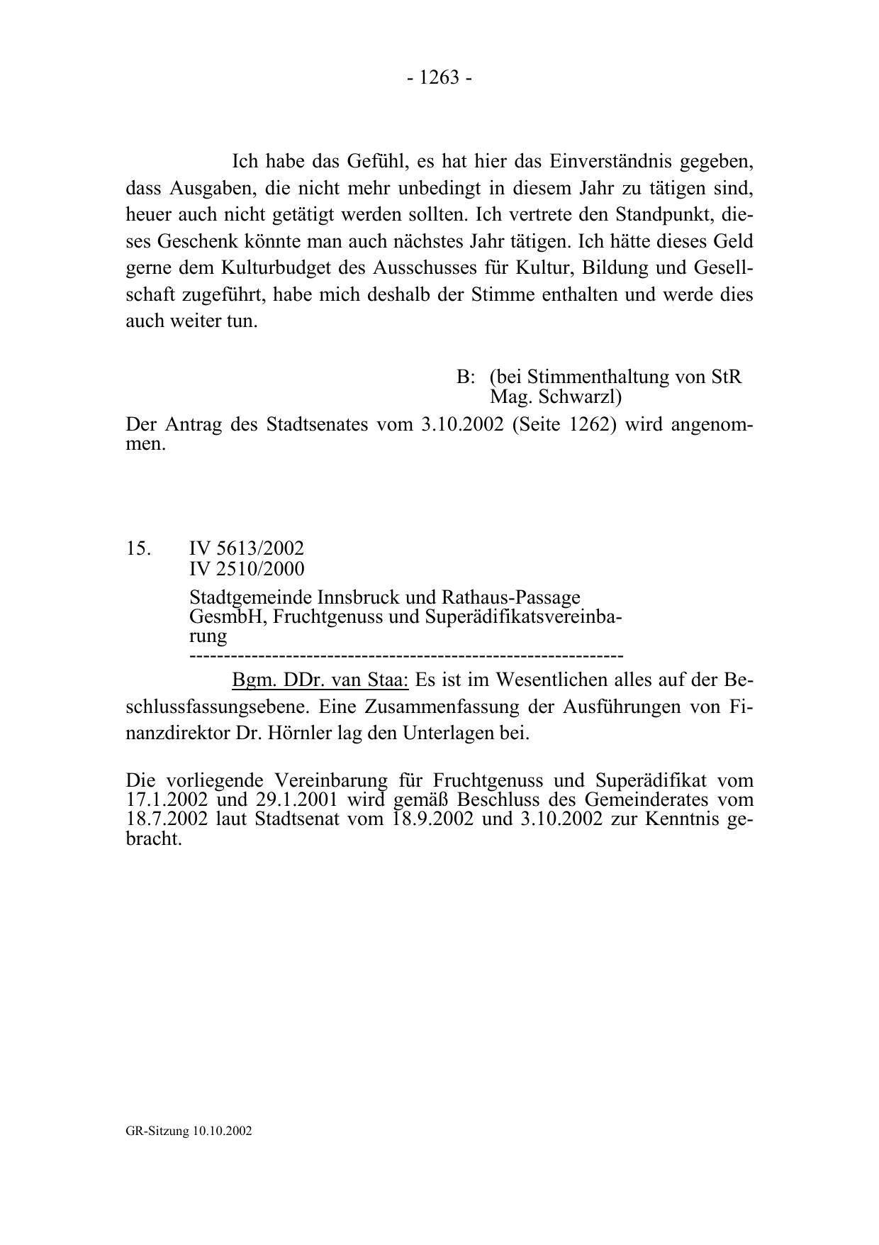 --------------------------------------------------------------Bgm. DDr. van Staa: Es ist im Wesentlichen alles auf der Beschlussfassungsebene. Eine Zusammenfassung der Ausführungen von Finanzdirektor Dr. Hörnler lag den Unterlagen bei.
