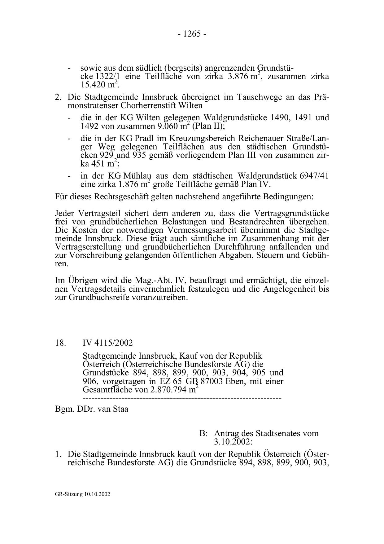 1. Die Stadtgemeinde Innsbruck kauft von der Republik Österreich (Österreichische Bundesforste AG) die Grundstücke 894, 898, 899, 900, 903,