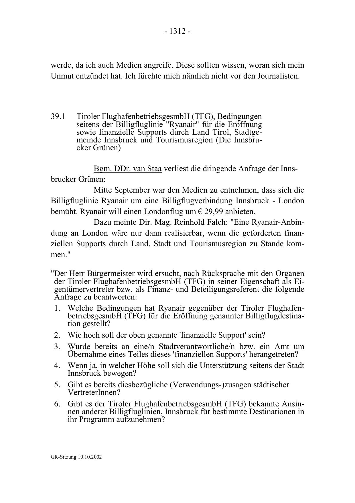 Bgm. DDr. van Staa verliest die dringende Anfrage der Innsbrucker Grünen: