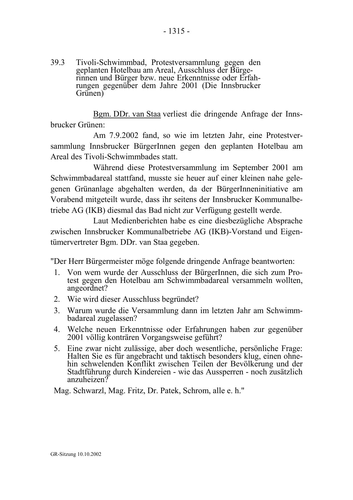 Am 7.9.2002 fand, so wie im letzten Jahr, eine Protestversammlung Innsbrucker BürgerInnen gegen den geplanten Hotelbau am