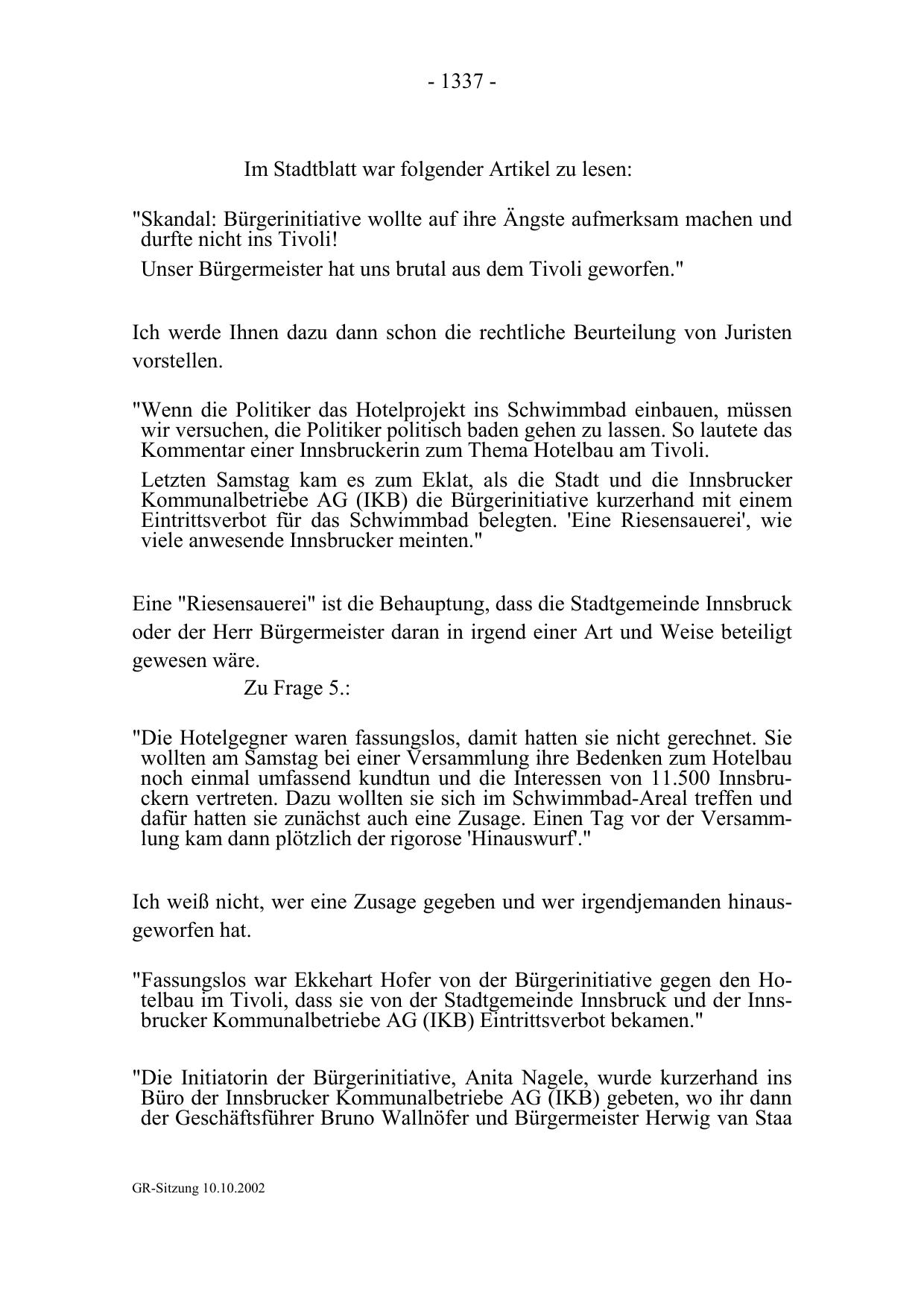 "Fassungslos war Ekkehart Hofer von der Bürgerinitiative gegen den Hotelbau im Tivoli, dass sie von der Stadtgemeinde Innsbruck und der Innsbrucker Kommunalbetriebe AG (IKB) Eintrittsverbot bekamen."