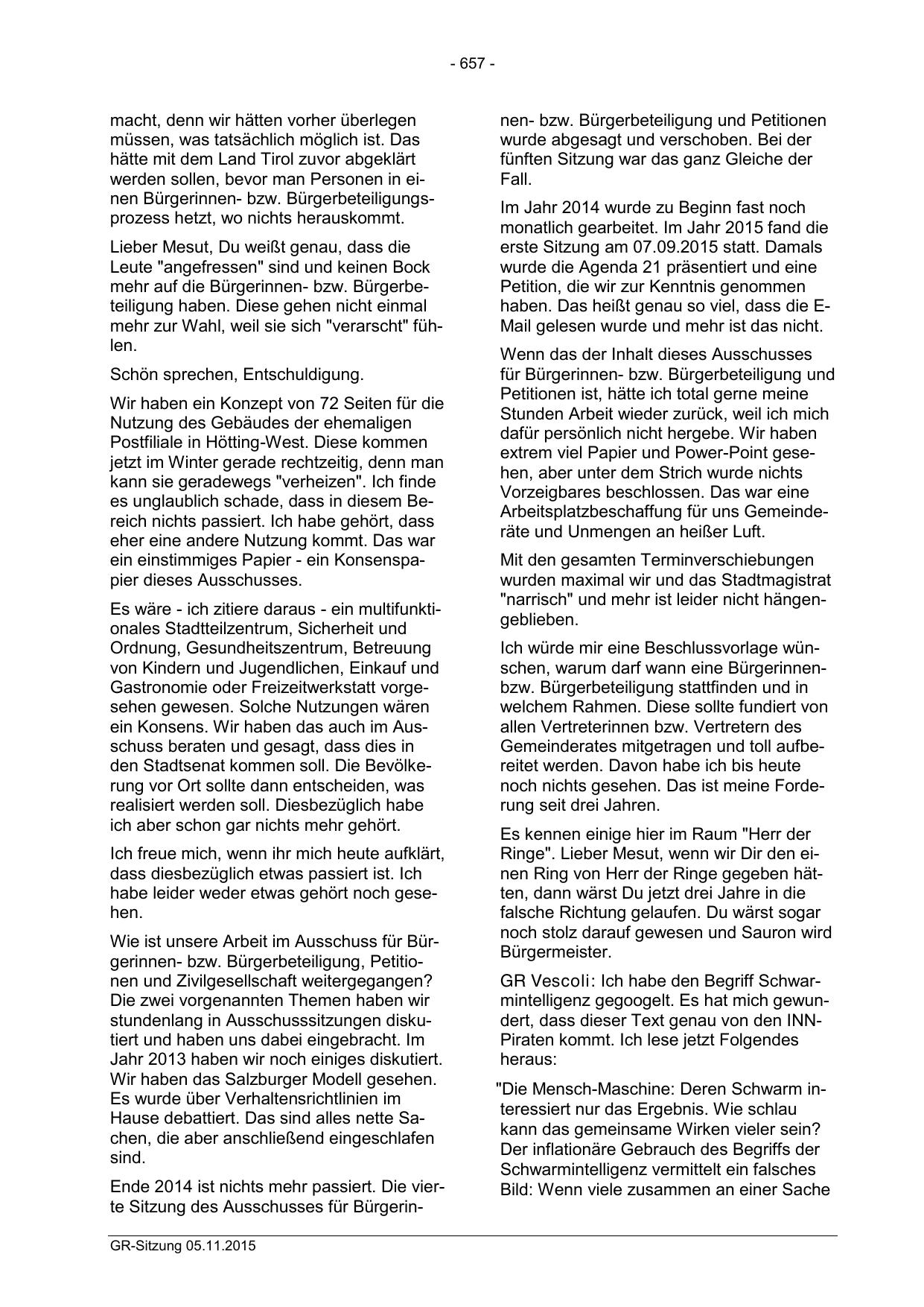 GR Vescoli: Ich habe den Begriff Schwarmintelligenz gegoogelt. Es hat mich gewundert, dass dieser Text genau von den INNPiraten kommt. Ich lese jetzt Folgendes