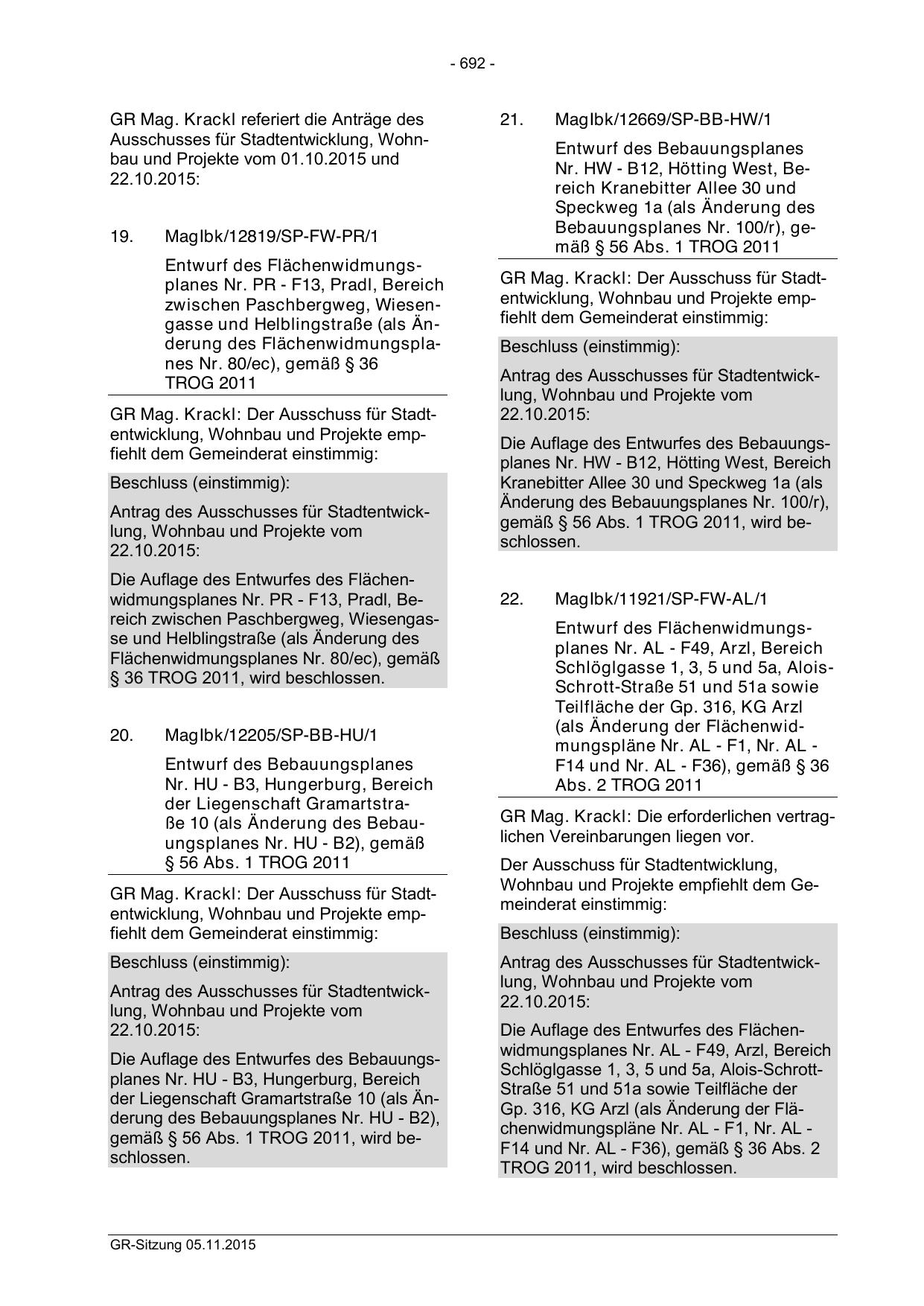 GR Mag. Krackl: Der Ausschuss für Stadtentwicklung, Wohnbau und Projekte empfiehlt dem Gemeinderat einstimmig: