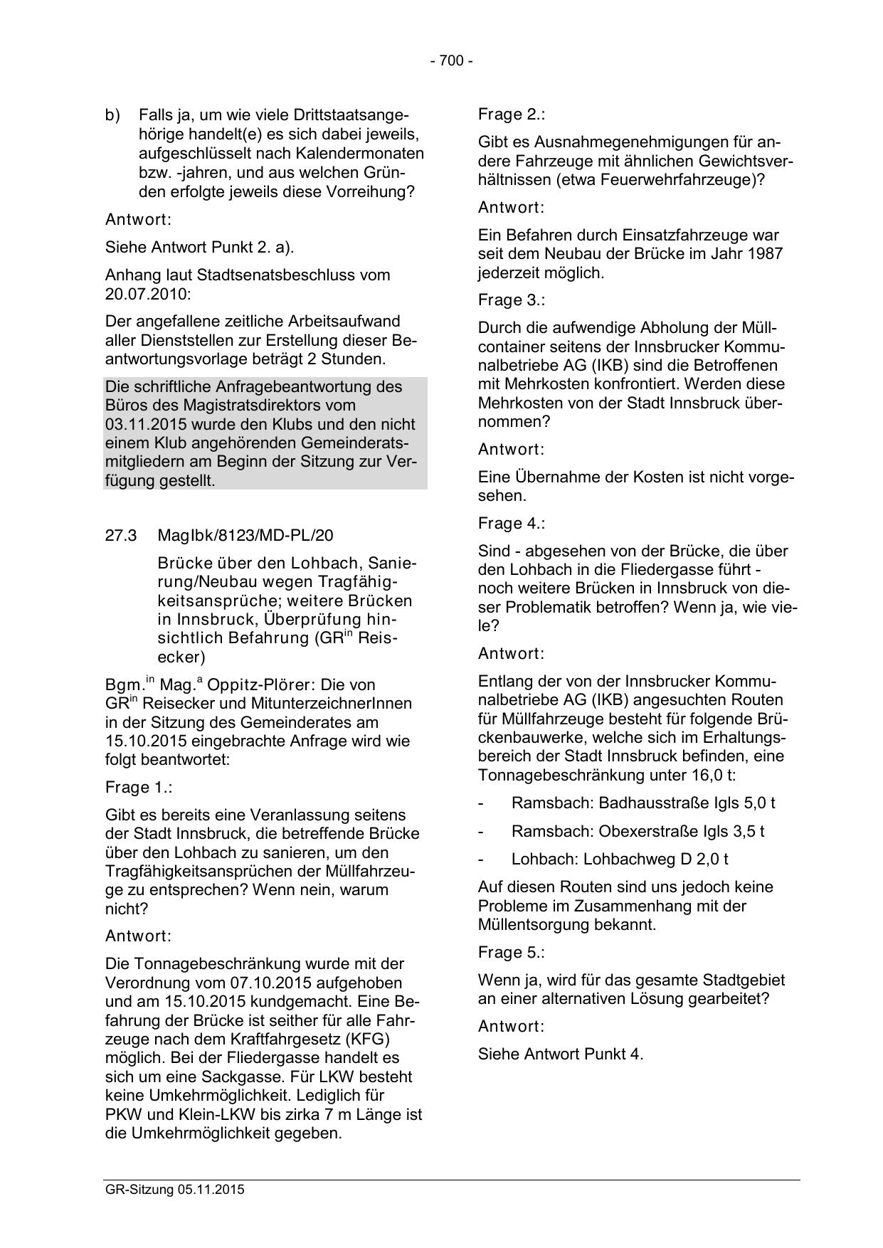 den Lohbach in die Fliedergasse führt noch weitere Brücken in Innsbruck von dieser Problematik betroffen? Wenn ja, wie viele?