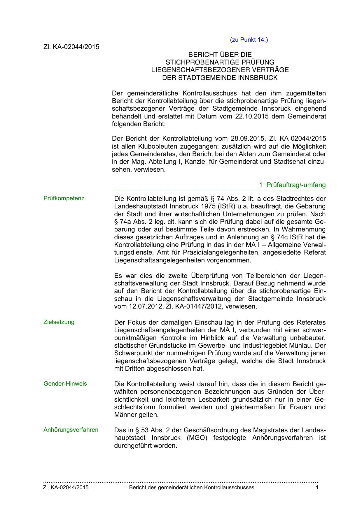 Bericht der Kontrollabteilung über die stichprobenartige Prüfung liegenschaftsbezogener Verträge der Stadtgemeinde Innsbruck eingehend