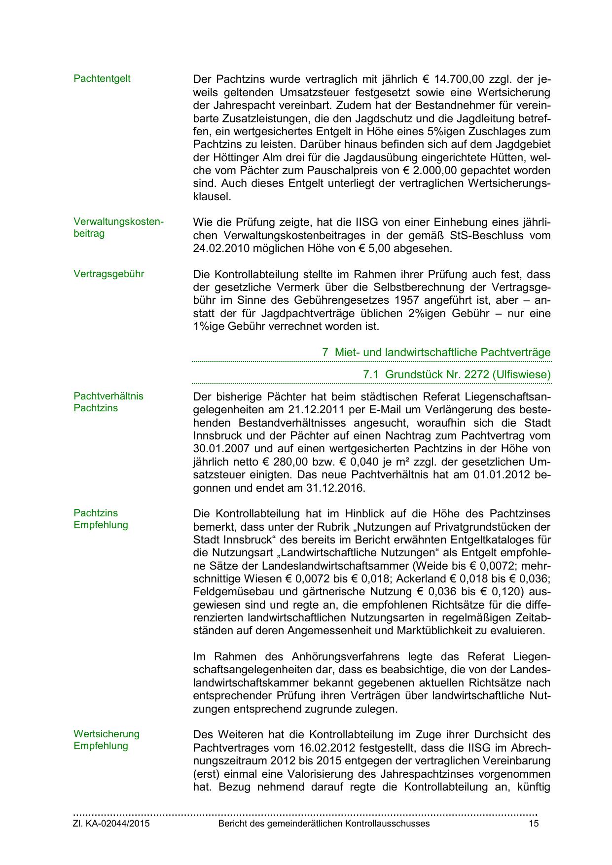Die Kontrollabteilung hat im Hinblick auf die Höhe des Pachtzinses