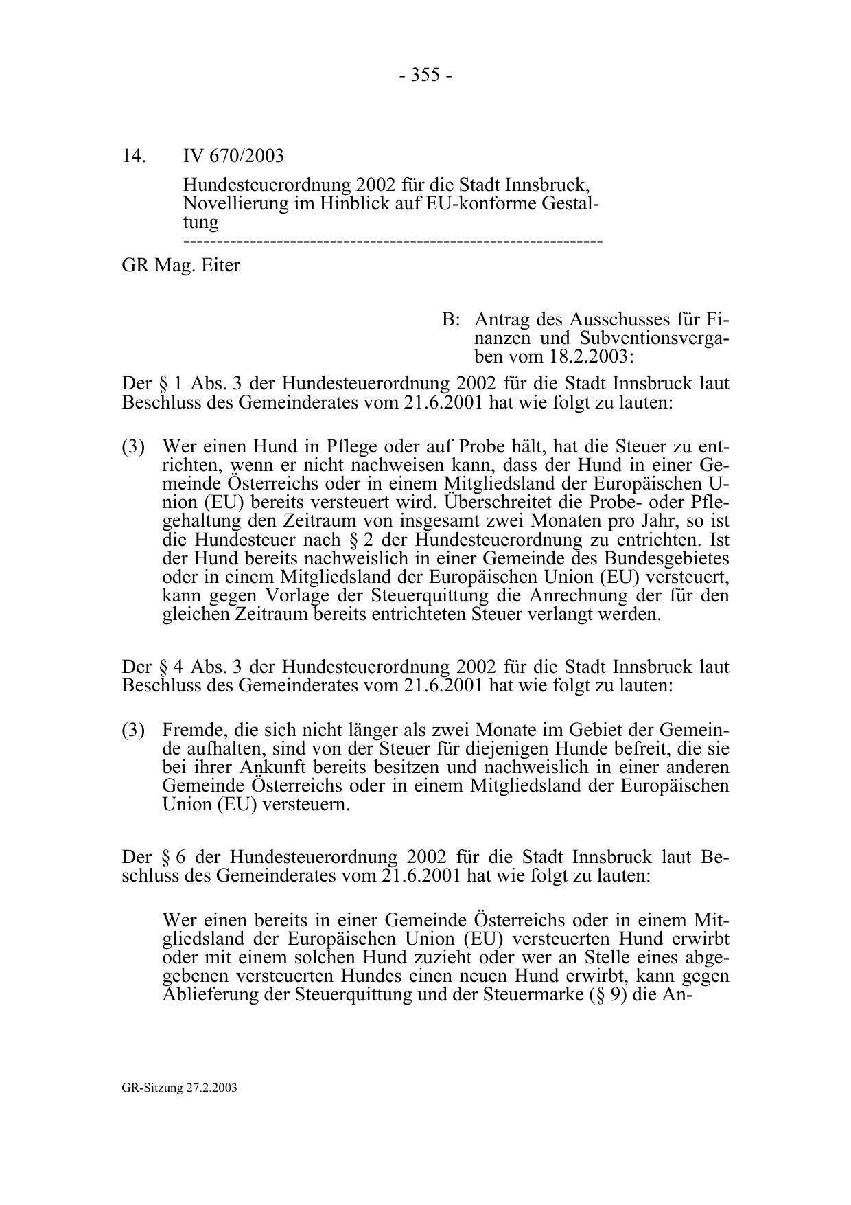 Hundesteuerordnung 2002 für die Stadt Innsbruck,