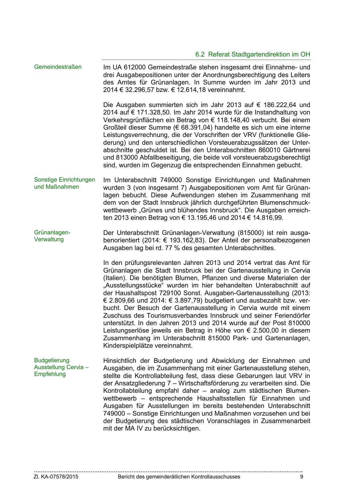 dem von der Stadt Innsbruck jährlich durchgeführten Blumenschmuckwettbewerb „Grünes und blühendes Innsbruck“. Die Ausgaben erreichten 2013 einen Betrag von € 13.195,46 und 2014 € 14.816,99.