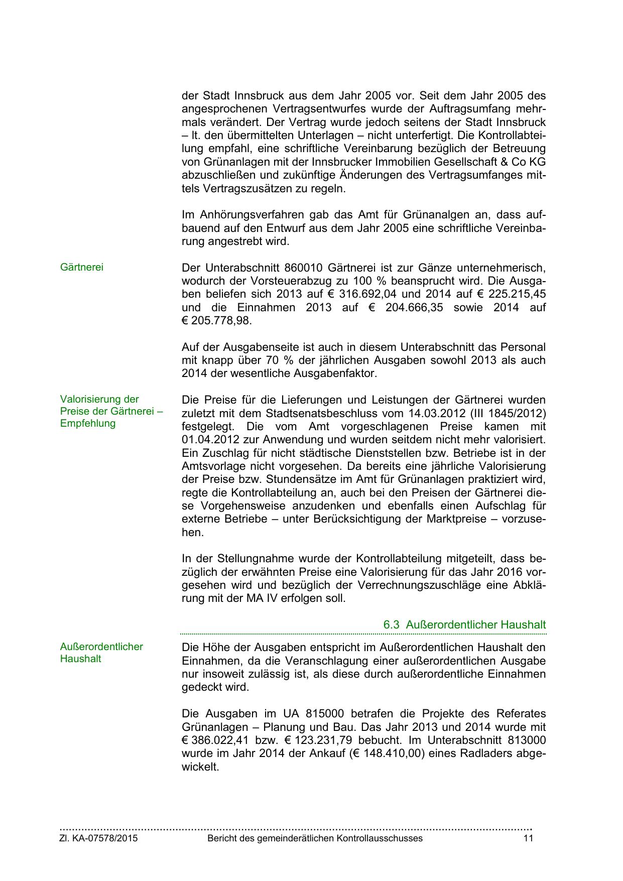 In der Stellungnahme wurde der Kontrollabteilung mitgeteilt, dass bezüglich der erwähnten Preise eine Valorisierung für das Jahr 2016 vorgesehen wird und bezüglich der Verrechnungszuschläge eine Abklärung mit der MA IV erfolgen soll.