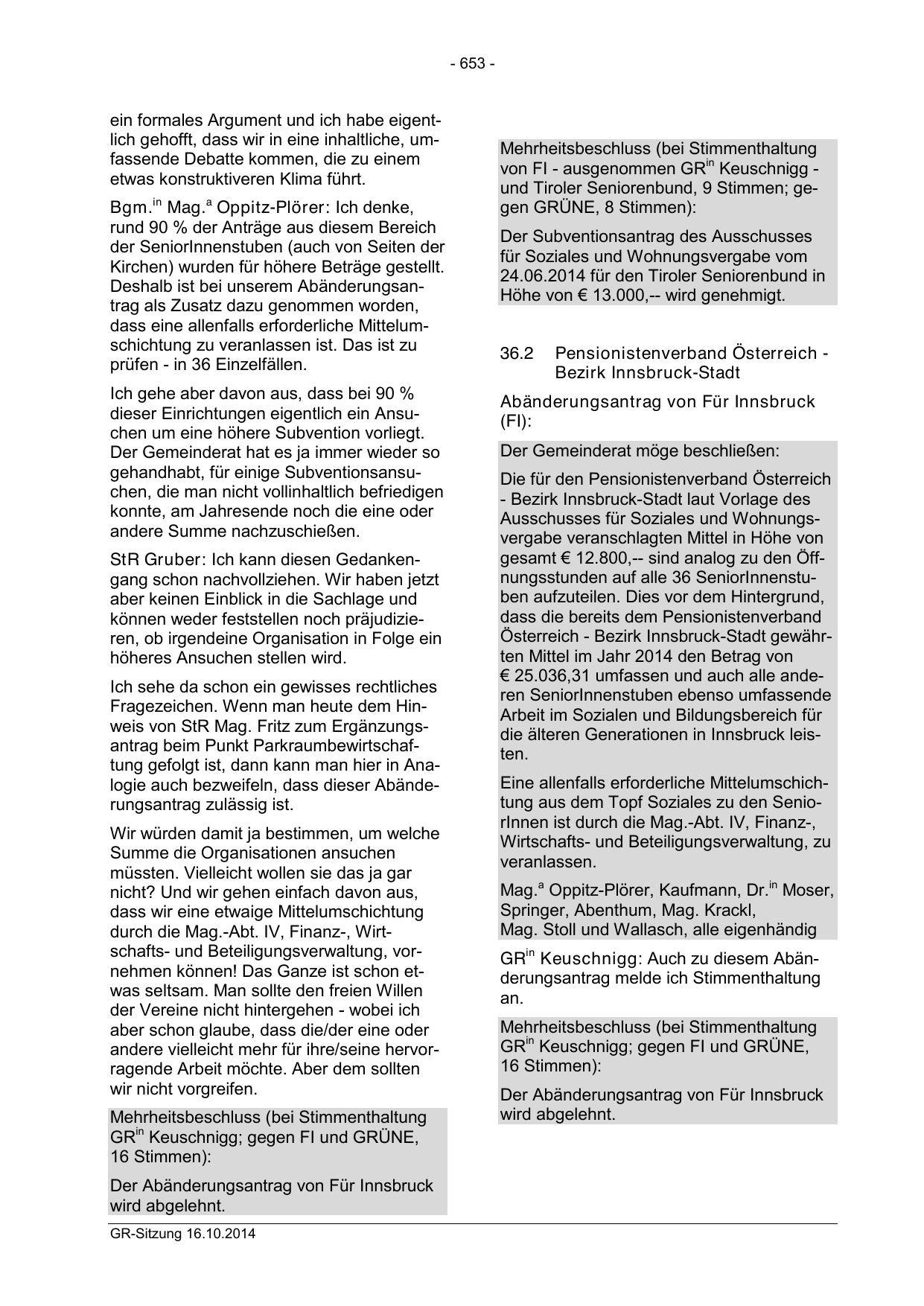 von FI - ausgenommen GRin Keuschnigg und Tiroler Seniorenbund, 9 Stimmen; gegen GRÜNE, 8 Stimmen):