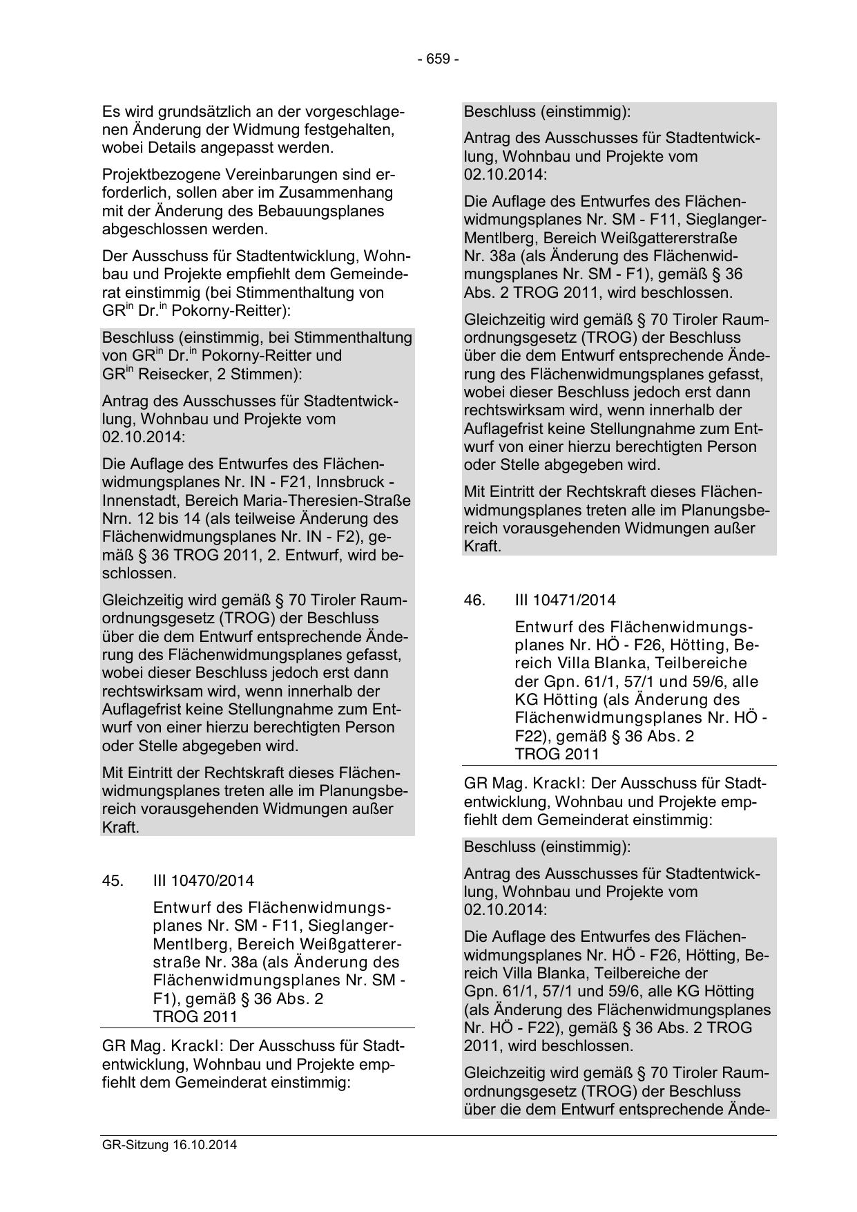 Flächenwidmungsplanes Nr. IN - F2), gemäß § 36 TROG 2011, 2. Entwurf, wird beschlossen.
