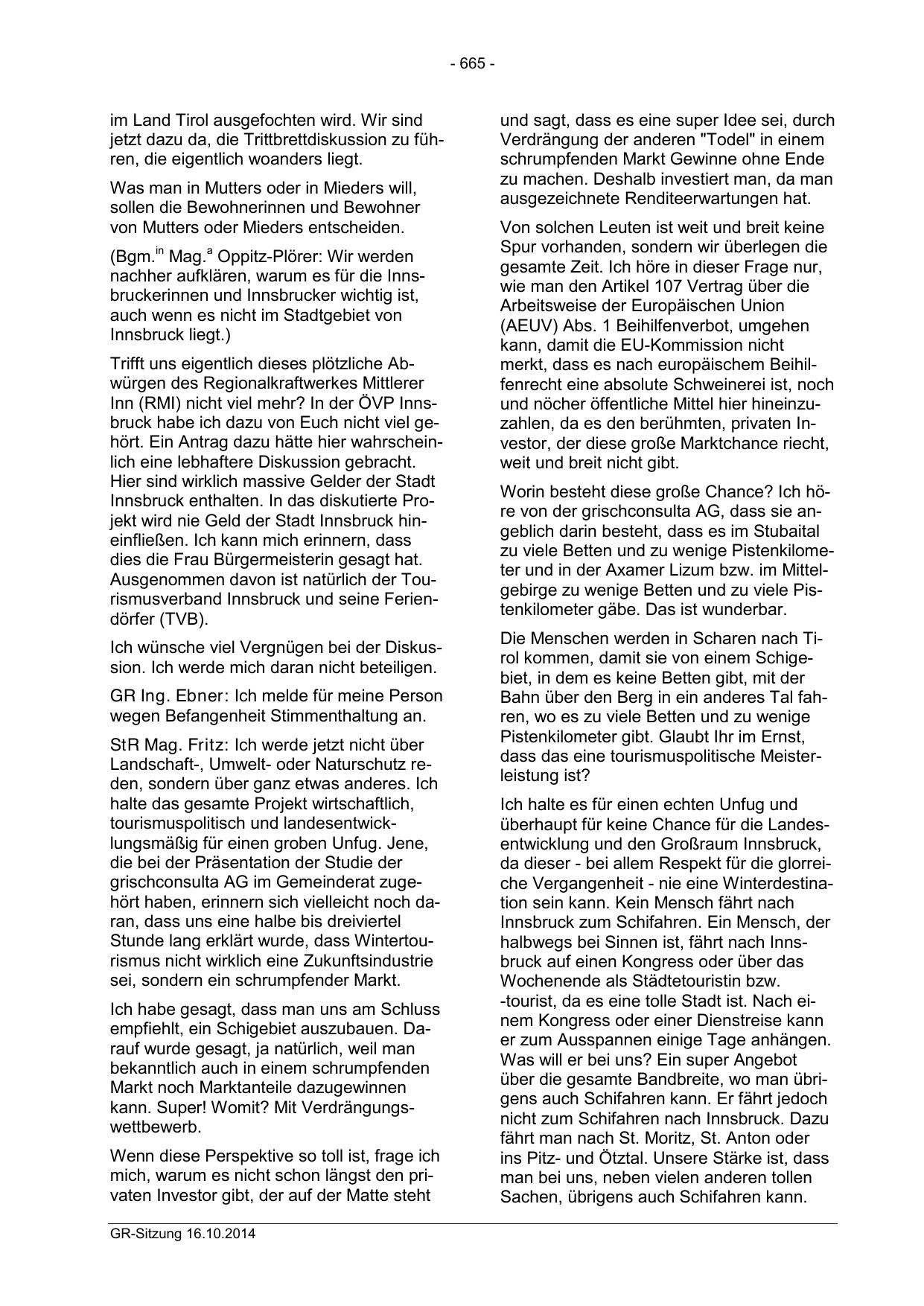 Innsbruck enthalten. In das diskutierte Projekt wird nie Geld der Stadt Innsbruck hineinfließen. Ich kann mich erinnern, dass