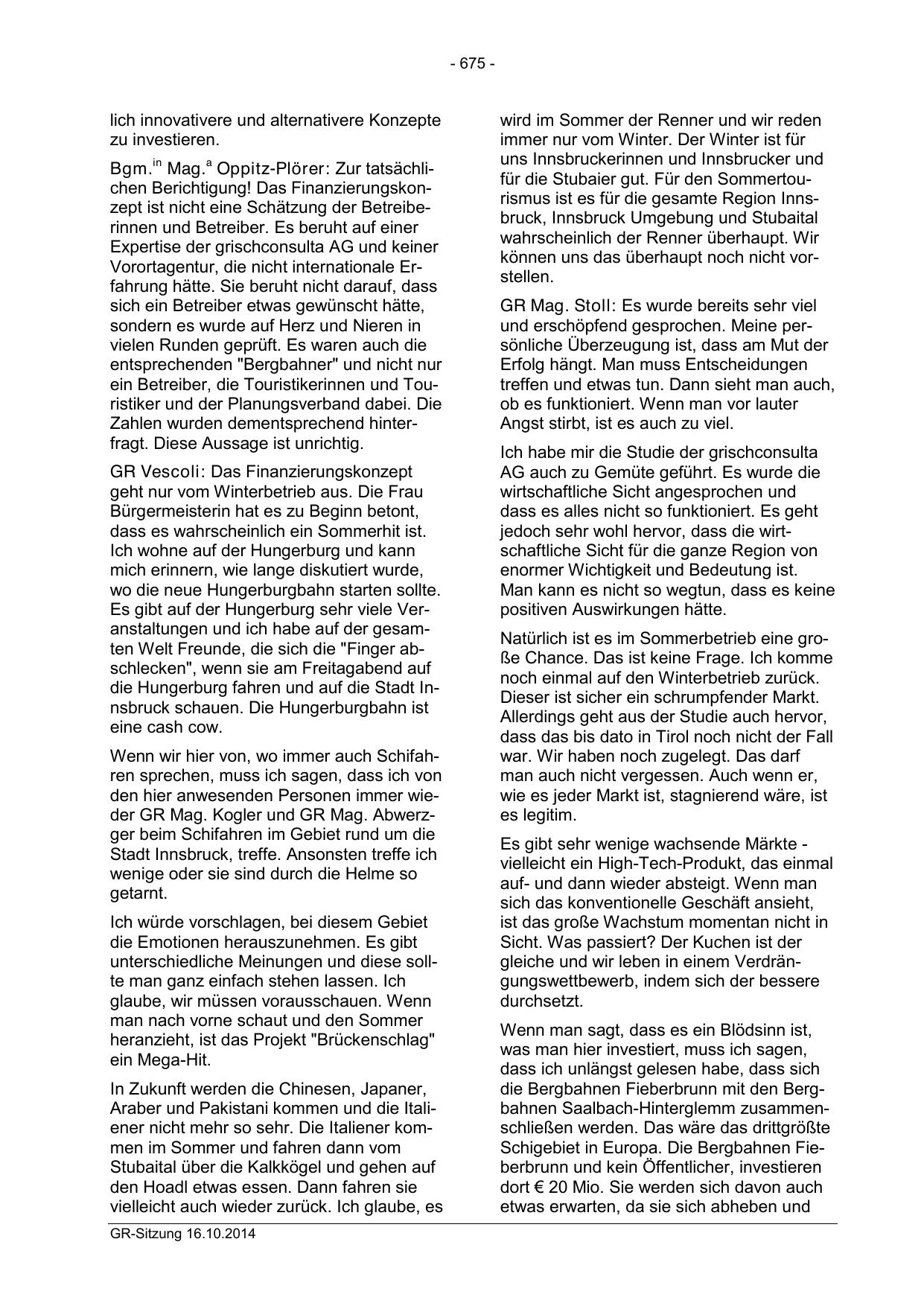 Bgm.in Mag.a Oppitz-Plörer: Zur tatsächlichen Berichtigung! Das Finanzierungskonzept ist nicht eine Schätzung der Betreiberinnen und Betreiber. Es beruht auf einer