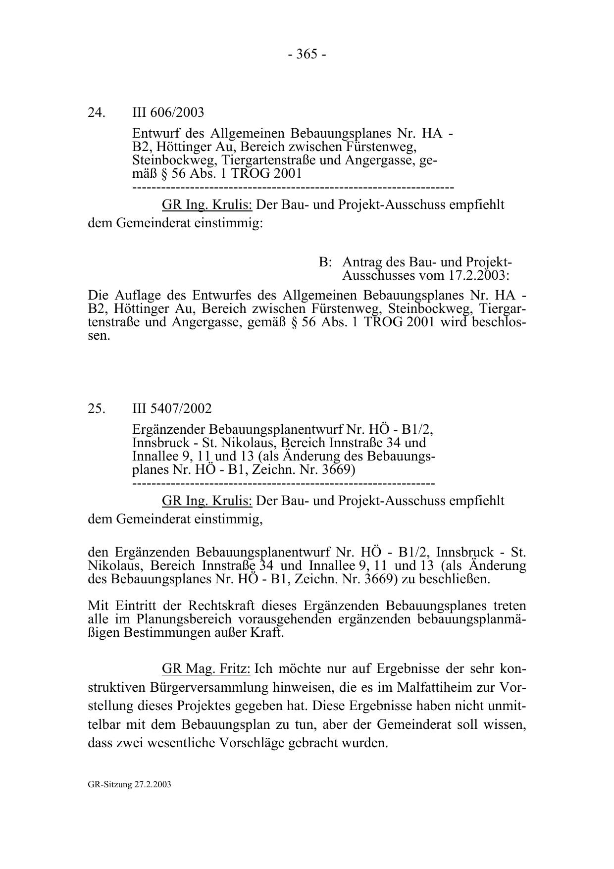Die Auflage des Entwurfes des Allgemeinen Bebauungsplanes Nr. HA B2, Höttinger Au, Bereich zwischen Fürstenweg, Steinbockweg, Tiergartenstraße und Angergasse, gemäß § 56 Abs. 1 TROG 2001 wird beschlossen.