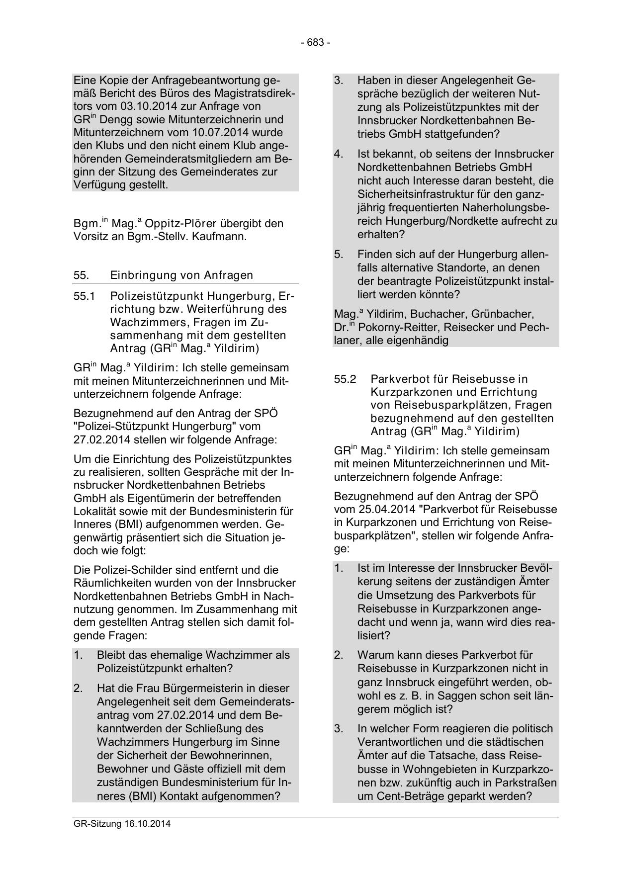 den Klubs und den nicht einem Klub angehörenden Gemeinderatsmitgliedern am Beginn der Sitzung des Gemeinderates zur