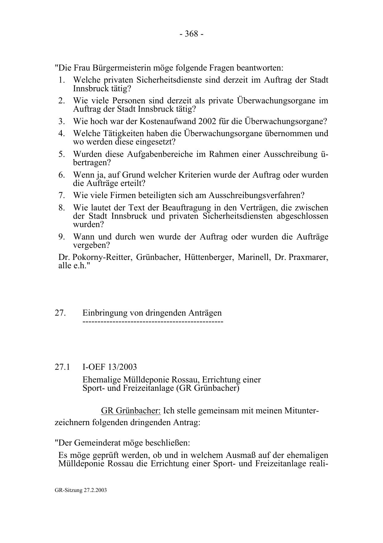 Mülldeponie Rossau die Errichtung einer Sport- und Freizeitanlage realiGR-Sitzung 27.2.2003