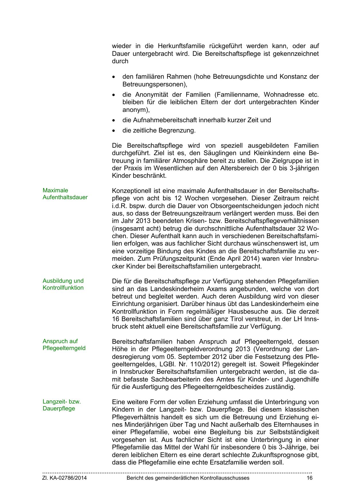 eine vorzeitige Bindung des Kindes an die Bereitschaftsfamilie zu vermeiden. Zum Prüfungszeitpunkt (Ende April 2014) waren vier Innsbrucker Kinder bei Bereitschaftsfamilien untergebracht.