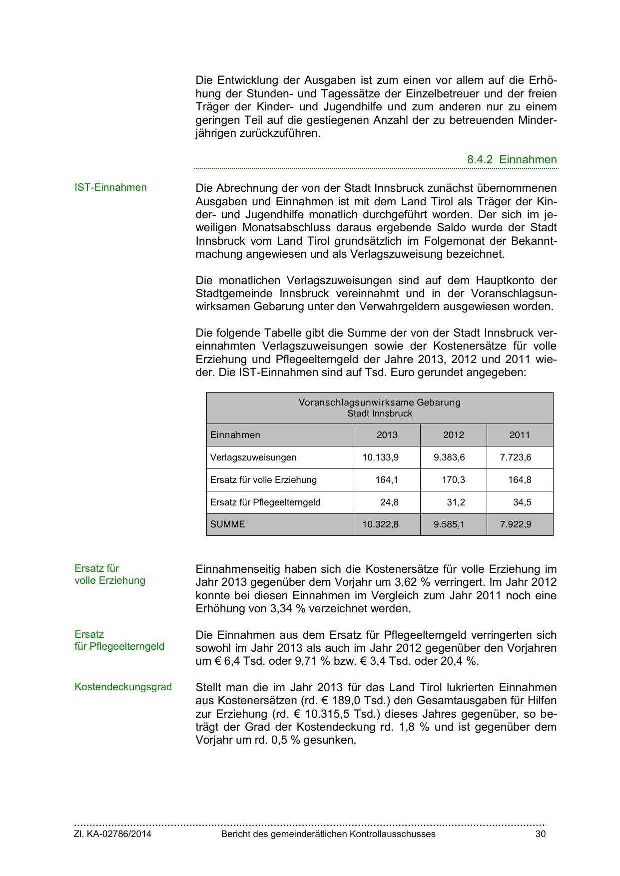 Die folgende Tabelle gibt die Summe der von der Stadt Innsbruck vereinnahmten Verlagszuweisungen sowie der Kostenersätze für volle