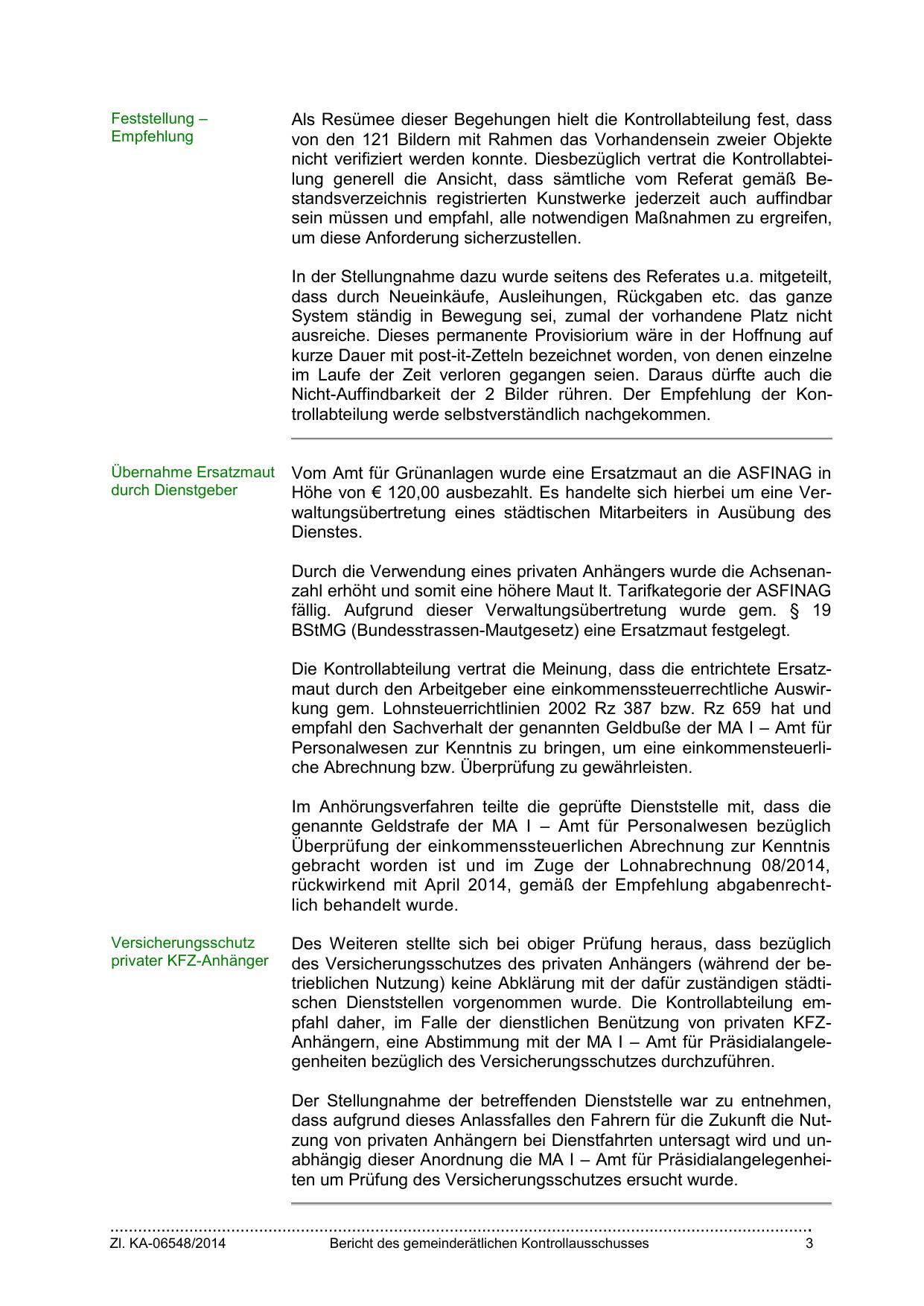 des Versicherungsschutzes des privaten Anhängers (während der betrieblichen Nutzung) keine Abklärung mit der dafür zuständigen städtischen Dienststellen vorgenommen wurde. Die Kontrollabteilung empfahl daher, im Falle der dienstlichen Benützung von privaten KFZAnhängern, eine Abstimmung mit der MA I – Amt für Präsidialangelegenheiten bezüglich des Versicherungsschutzes durchzuführen.