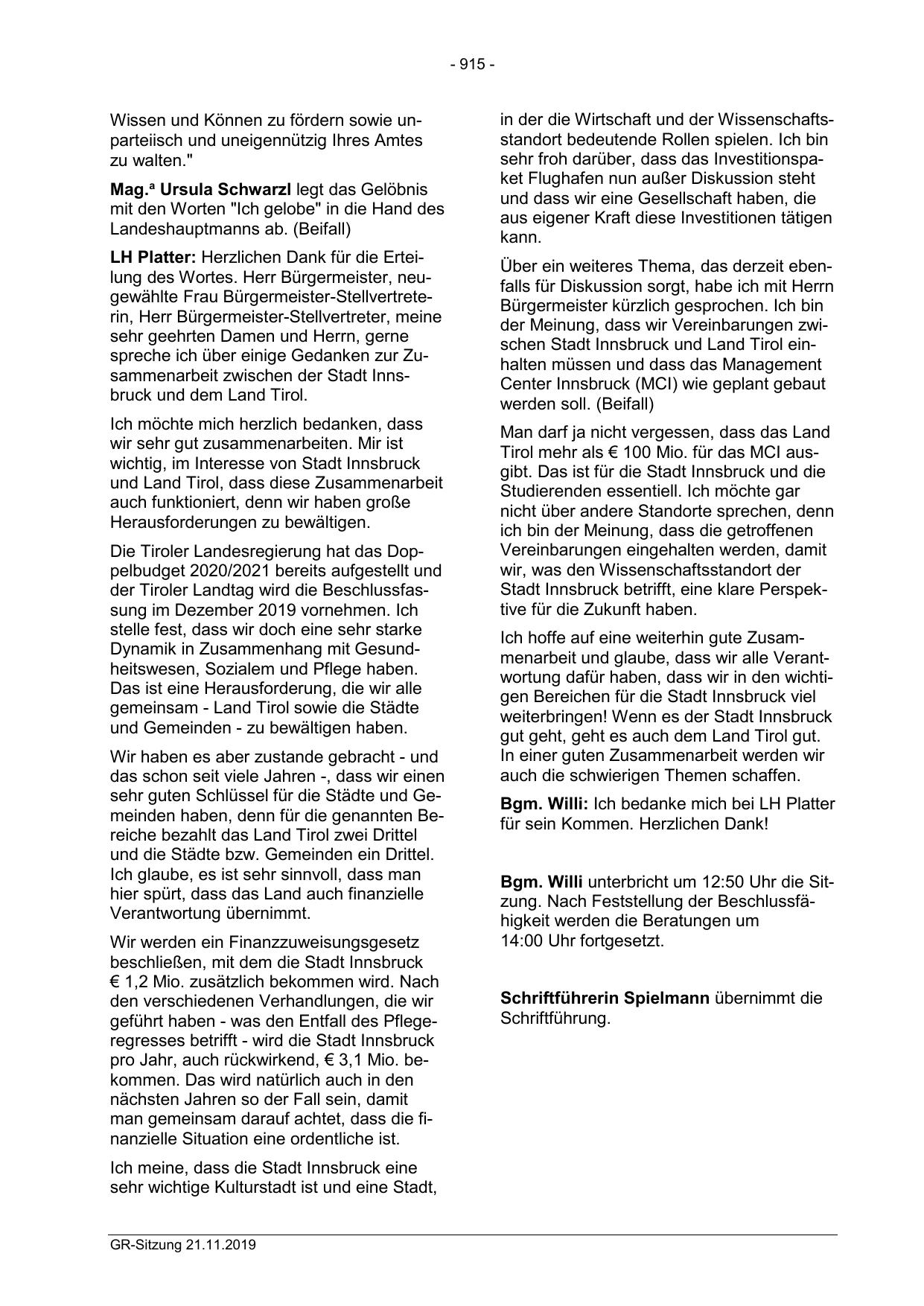 Ich hoffe auf eine weiterhin gute Zusammenarbeit und glaube, dass wir alle Verantwortung dafür haben, dass wir in den wichtigen Bereichen für die Stadt Innsbruck viel