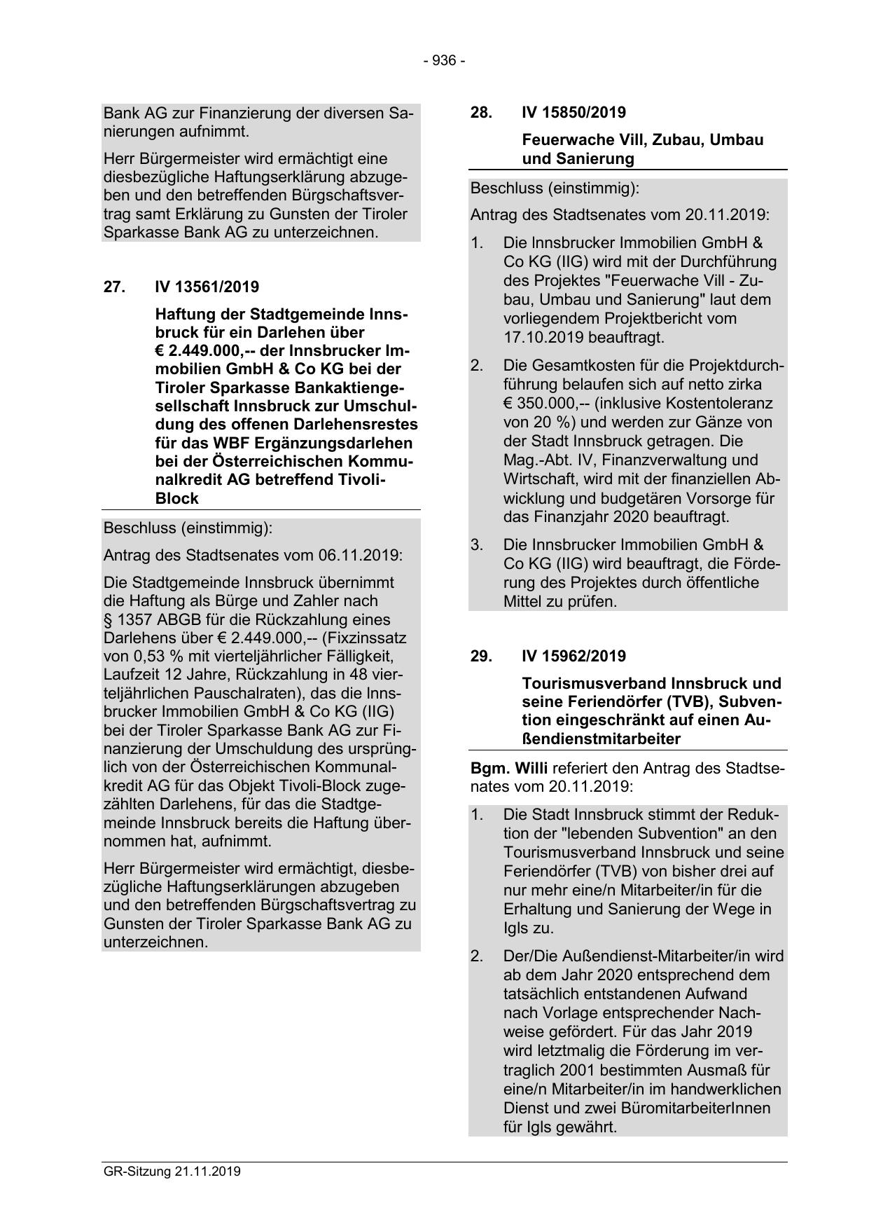 bei der Tiroler Sparkasse Bank AG zur Finanzierung der Umschuldung des ursprünglich von der Österreichischen Kommunalkredit AG für das Objekt Tivoli-Block zugezählten Darlehens, für das die Stadtgemeinde Innsbruck bereits die Haftung übernommen hat, aufnimmt.
