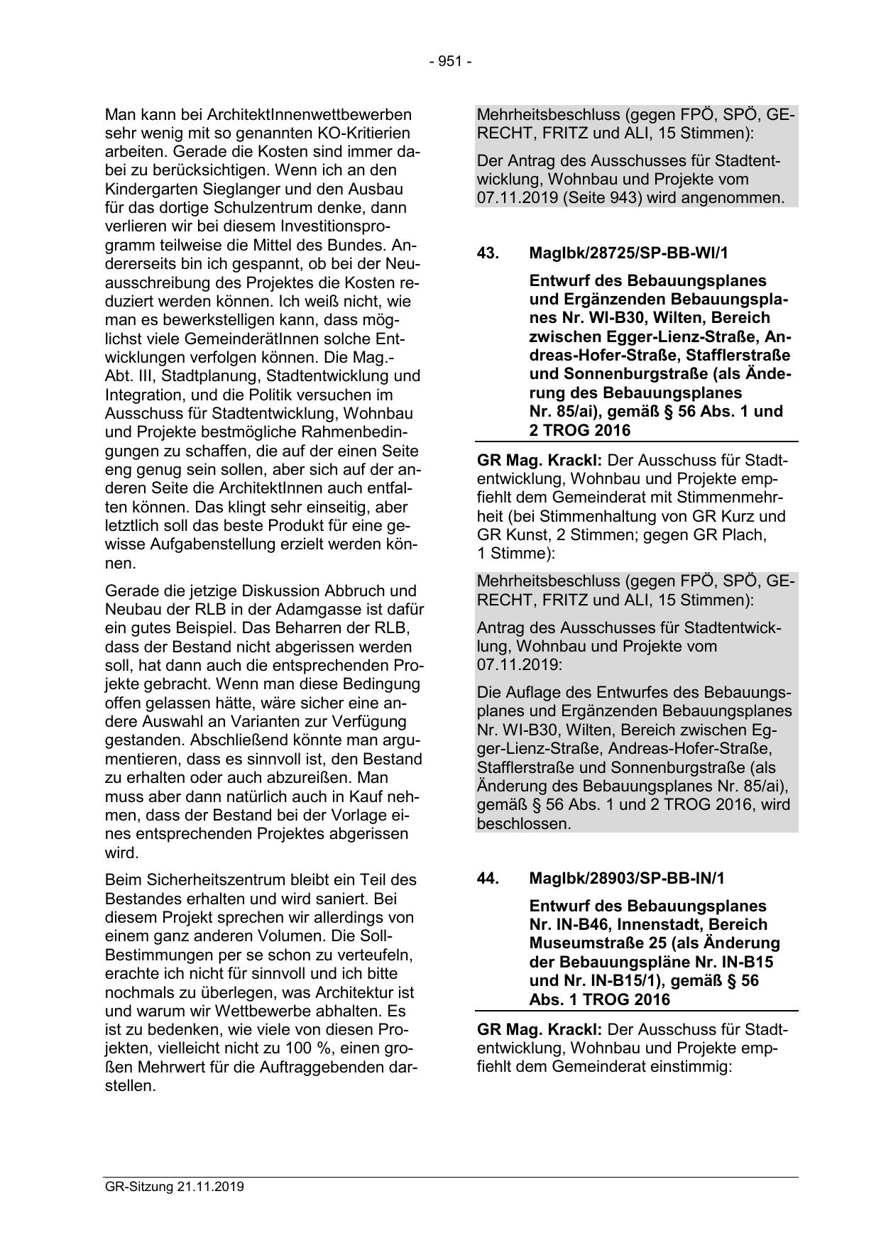 Mehrheitsbeschluss (gegen FPÖ, SPÖ, GERECHT, FRITZ und ALI, 15 Stimmen):