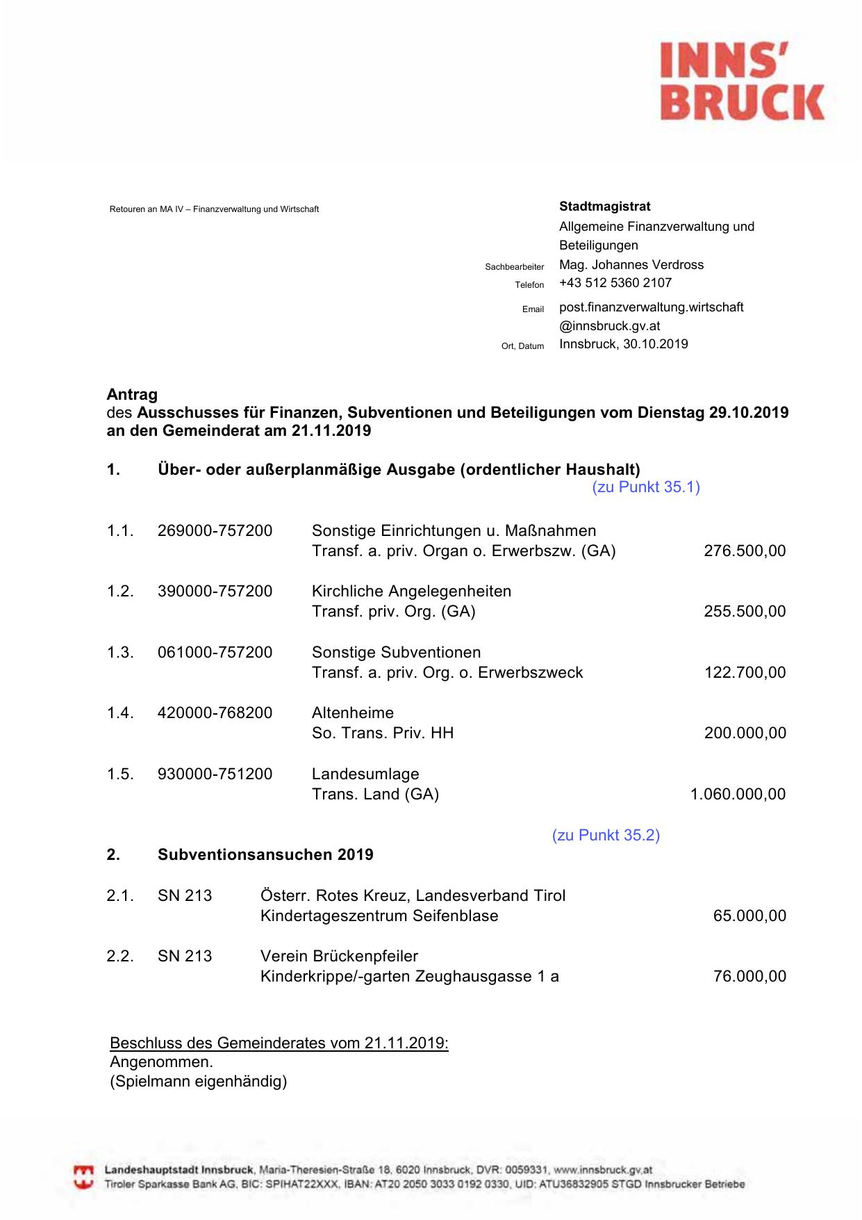 des Ausschusses für Finanzen, Subventionen und Beteiligungen vom Dienstag 29.10.2019