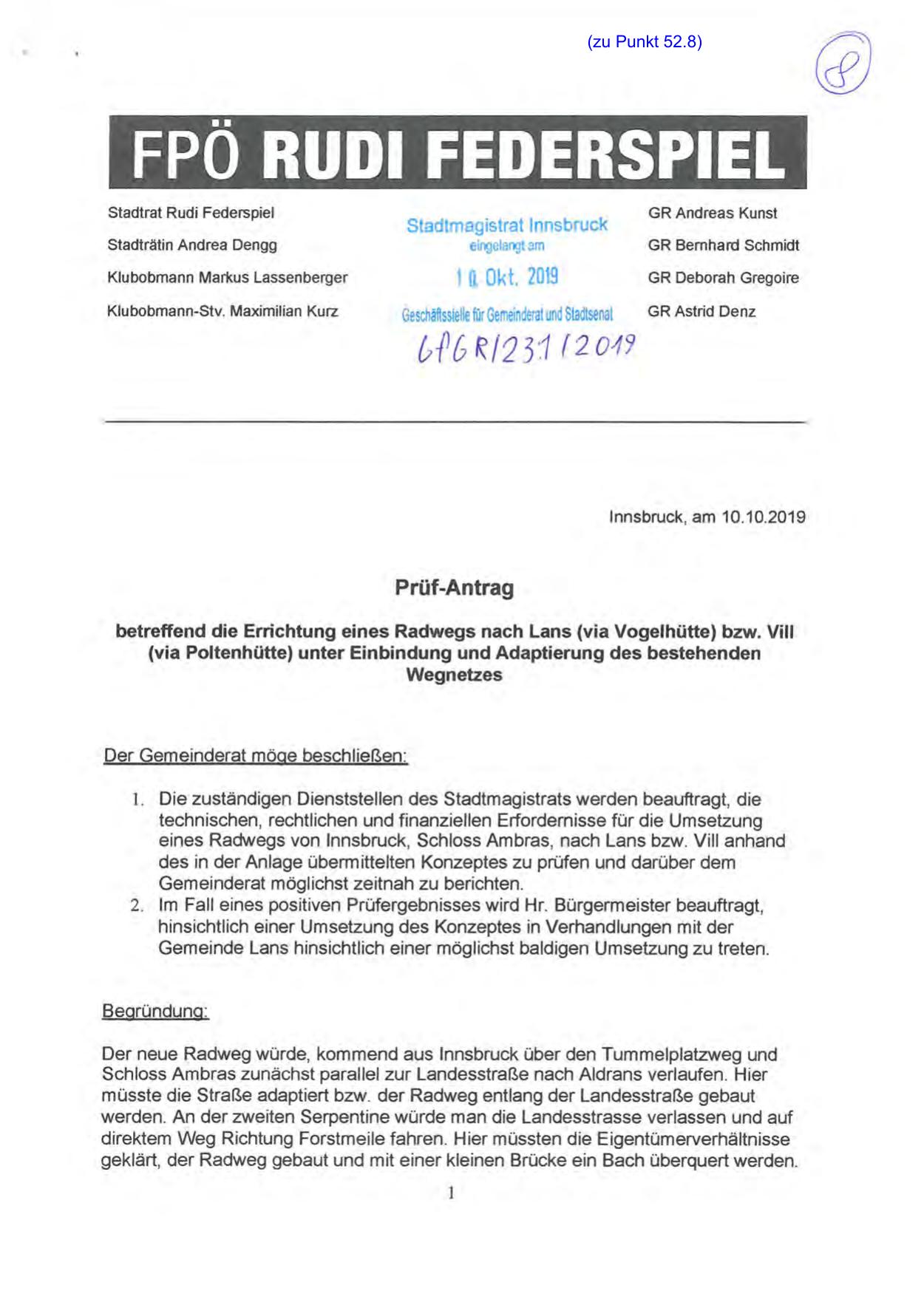 betreffend die Errichtung eines Radwegs nach Lans (via Vogelhütte) bzw. Vill