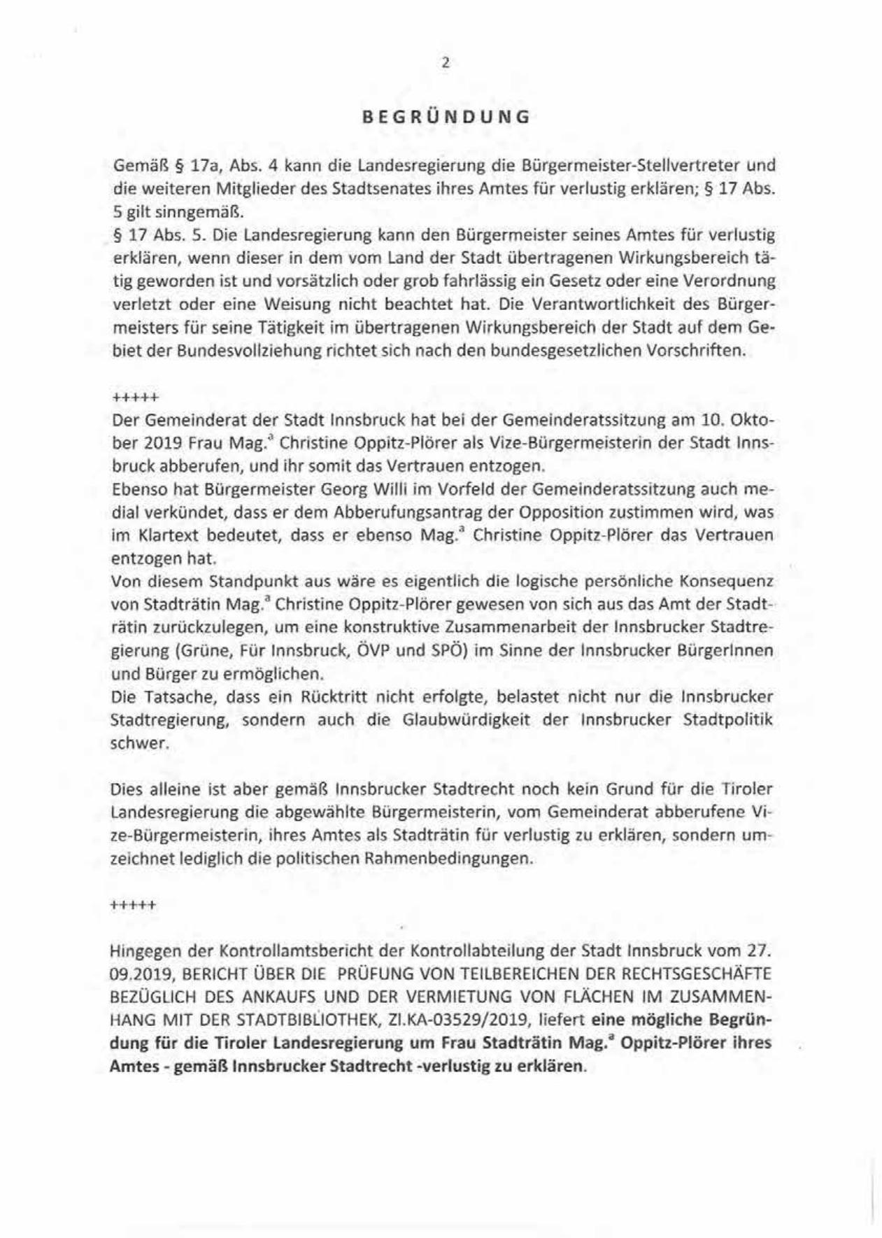 Der Gemeinderat der Stadt Innsbruck hat bei der Gemeinderatssitzung am 10. Oktober 2019 Frau Mag.a Christine Oppitz-Plörer als Vize-Bürgermeisterin der Stadt Innsbruck abberufen, und ihr somit das Vertrauen entzogen.