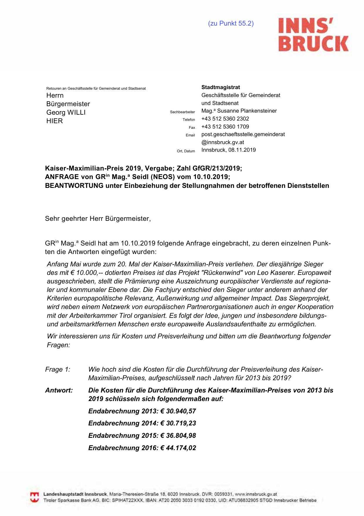Wie hoch sind die Kosten für die Durchführung der Preisverleihung des KaiserMaximilian-Preises, aufgeschlüsselt nach Jahren für 2013 bis 2019?