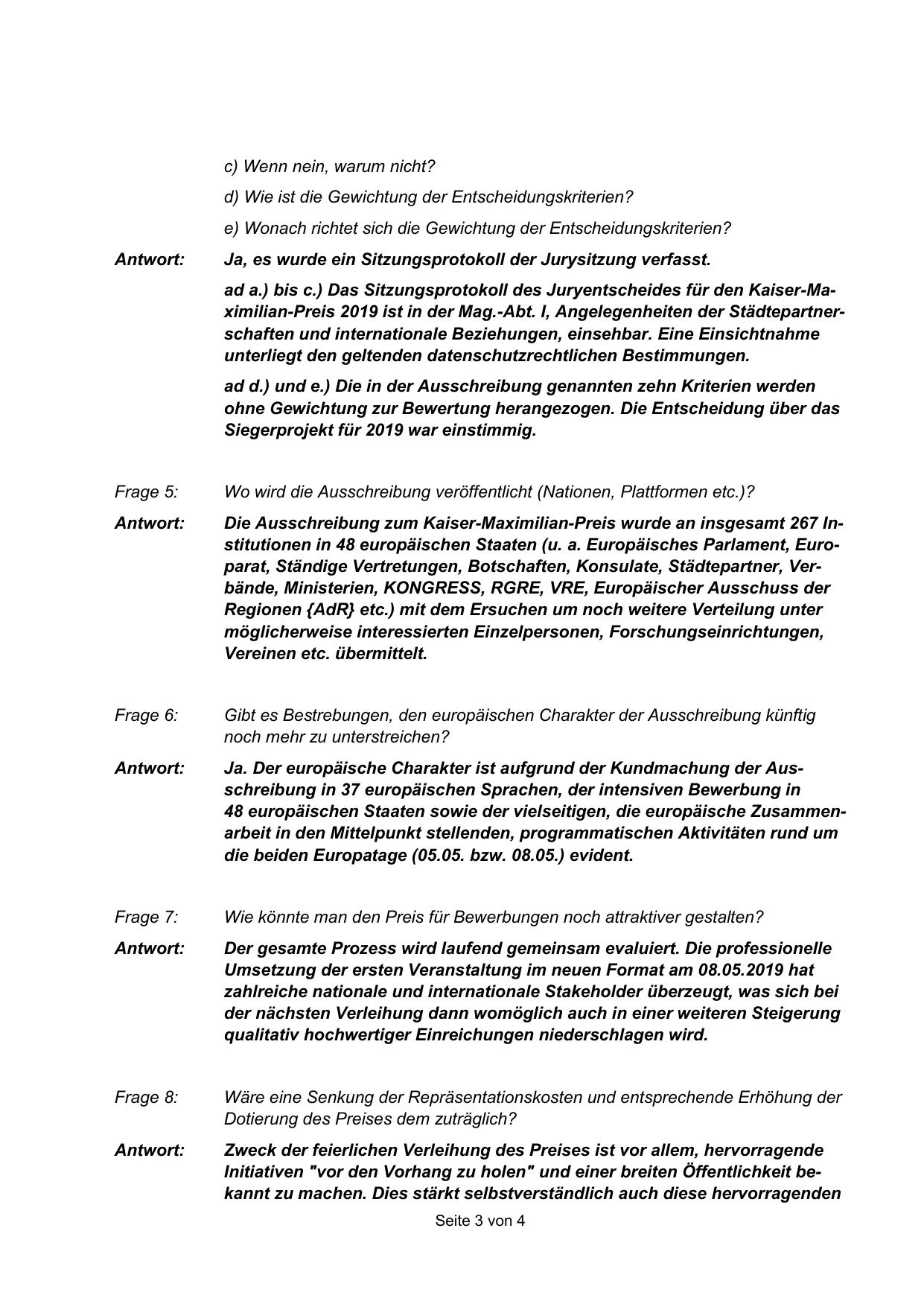 ad a.) bis c.) Das Sitzungsprotokoll des Juryentscheides für den Kaiser-Maximilian-Preis 2019 ist in der Mag.-Abt. I, Angelegenheiten der Städtepartnerschaften und internationale Beziehungen, einsehbar. Eine Einsichtnahme