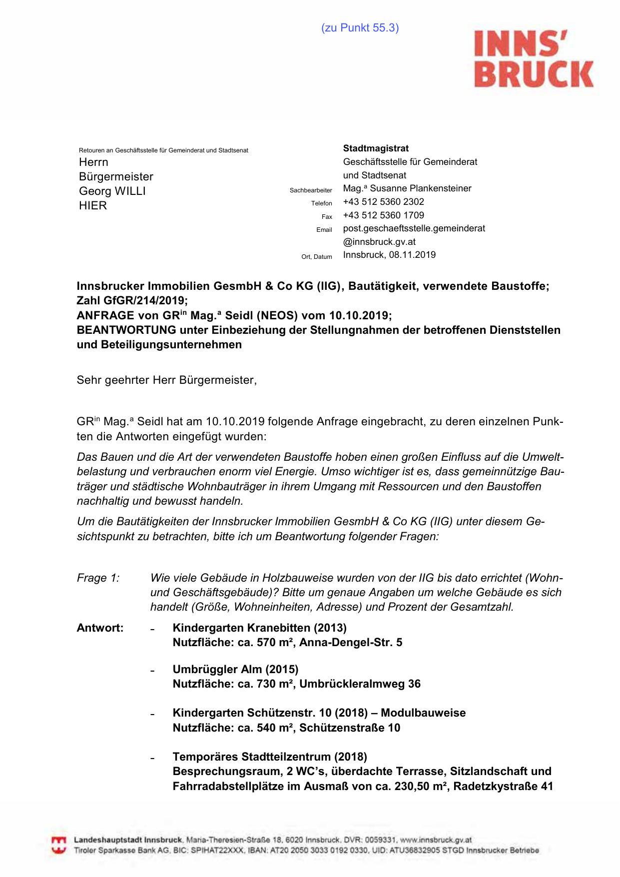 Um die Bautätigkeiten der Innsbrucker Immobilien GesmbH & Co KG (IIG) unter diesem Gesichtspunkt zu betrachten, bitte ich um Beantwortung folgender Fragen: